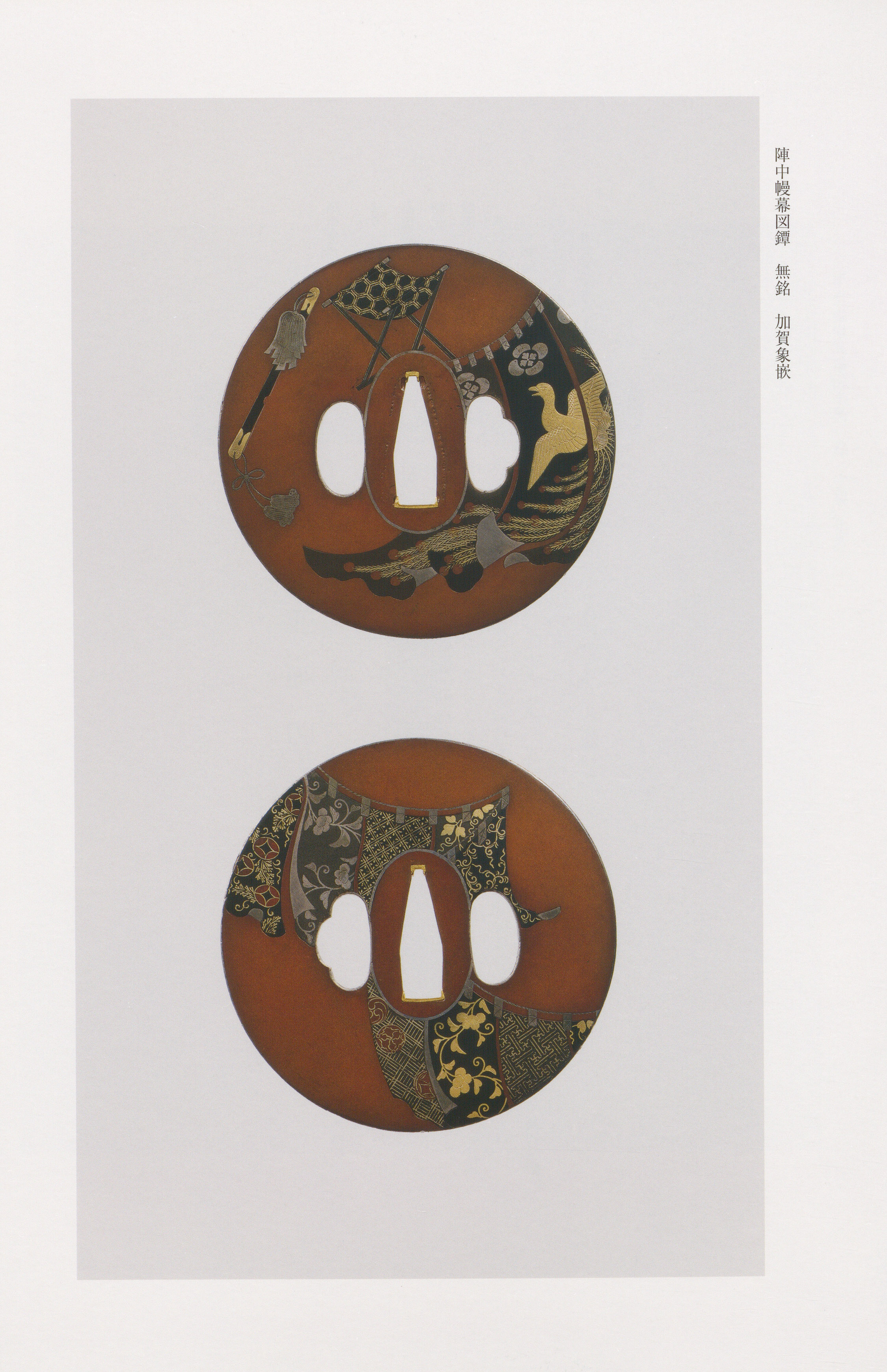 The hallmark of work lies in its compositional sophistication and technical versatility. Working on polished grounds () of or —occasionally using "hazy" silver ()—artisans deployed a remarkably wide palette of colored metals: gold, silver, scarlet copper (hi-irodō), and various alloys, often differentiating multiple tonal gradations within a single metal. The flat inlay is frequently enhanced with fine hairline engraving (), allowing for precise definition of pictorial elements. Characteristic motifs range from naturalistic scenes—autumn grasses, butterflies, dianthus with brushwood fences—to geometric abstractions and elegant Genji monogatari vignettes rendered through architectural elements. The compositional planning is notably skillful: dense, all-over arrangements are organized with clarity, spatial balance maintained through strategic placement of contrasting elements, and pictorial fields often enlivened by rhythmic movement.
