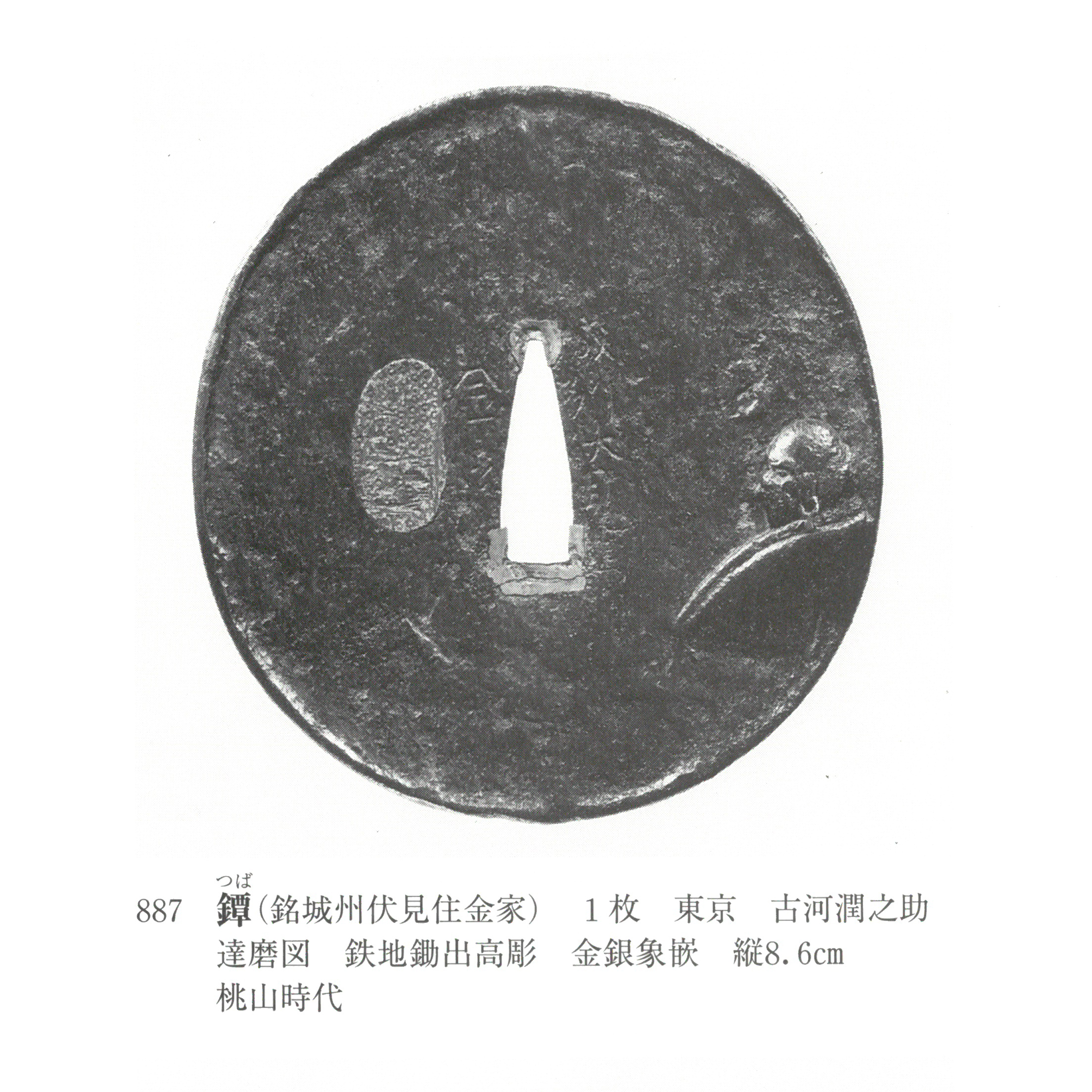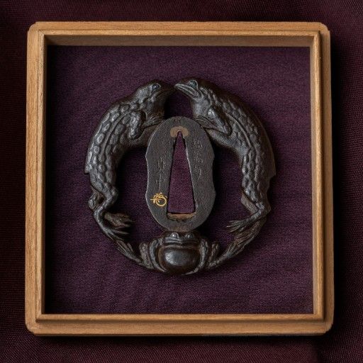 Kaneie is celebrated as the founder of pictorial-style (e- ), having introduced explicitly painterly subject matter into guard design during the period. Working from Fushimi in Yamashiro Province, he pioneered an approach that moved beyond ornamental patterns to embrace landscapes, figures, and Zen themes as primary compositional elements. His innovations extended beyond subject matter to form itself: while producing guards in standard , , and shapes, he also devised original silhouettes including double- and the distinctive (fist-shaped) form. Each work demonstrates careful integration between chosen motif and outline, with design and form considered together as a unified aesthetic conception.