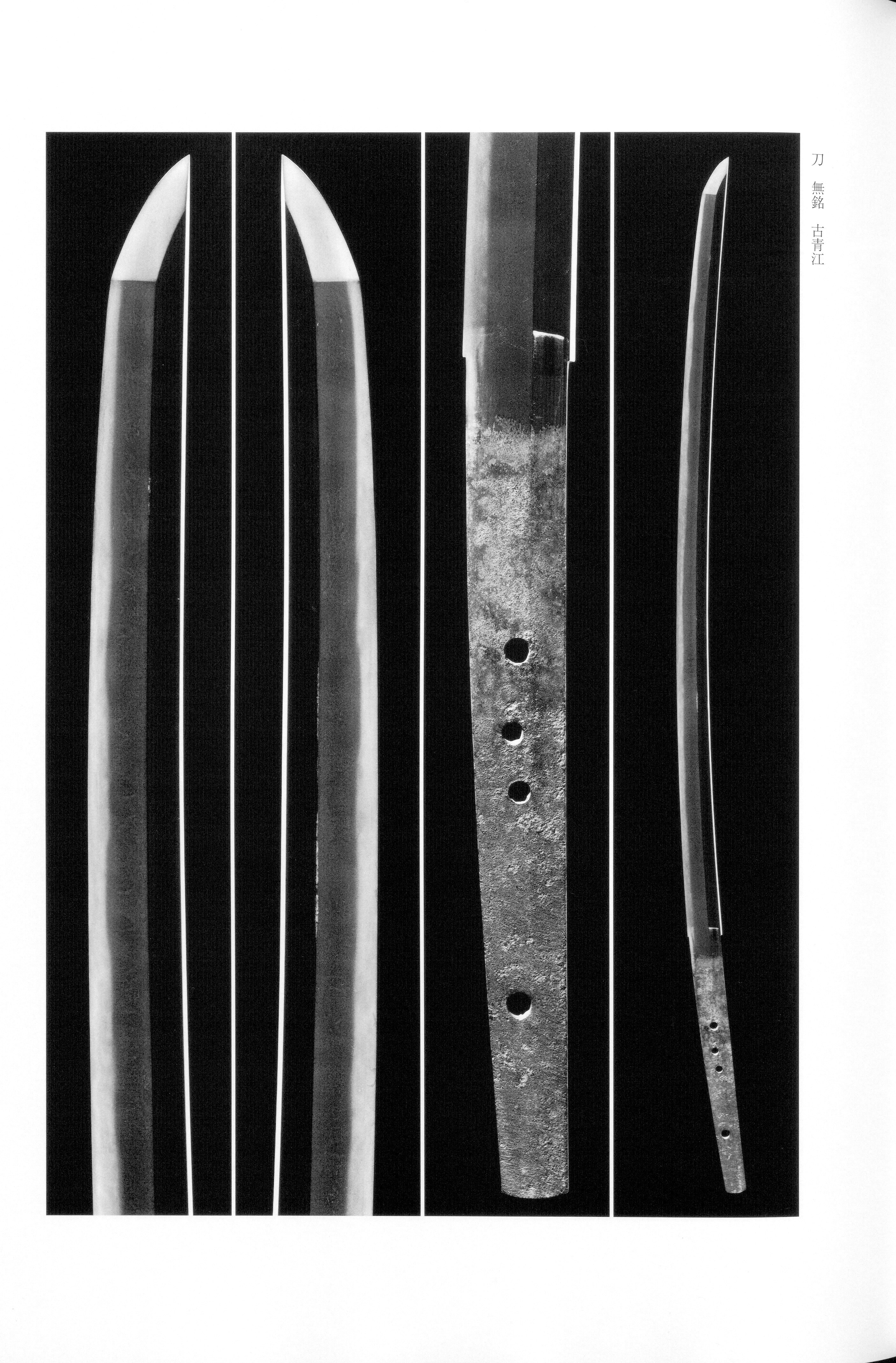 workmanship is distinguished by a characteristic forging pattern in which (wood-grain texture) stands prominently within an foundation, with the grain tending somewhat toward (standing texture), producing what is termed —a finely crinkled, crêpe-like surface. Many examples display mottled patches (, ) within the ground steel, together with very fine (ground martensite particles), delicate (pathway-like grain activity), and often a faint (irregular shadowy temper reflection). The tempering typically presents a foundation—either calm or mixed with small , , and patterns—executed in with the (temper boundary) frequently showing a (subdued) tendency. Internal activities such as abundant and (short and long projections), together with fine and (bright lines and trailing clouds), impart a deeply nuanced, richly flavored expression to the hardened edge. Blade forms are characteristically slender with pronounced taper from base to tip, high (waist-centered curvature) with (flare at the base), and (small point), preserving archaic elegance. A distinctive technical detail is the use of (large-angle diagonal) file marks on the tang, often with signatures cut on the haka- (inner-worn side)—features that help distinguish from contemporaneous work.