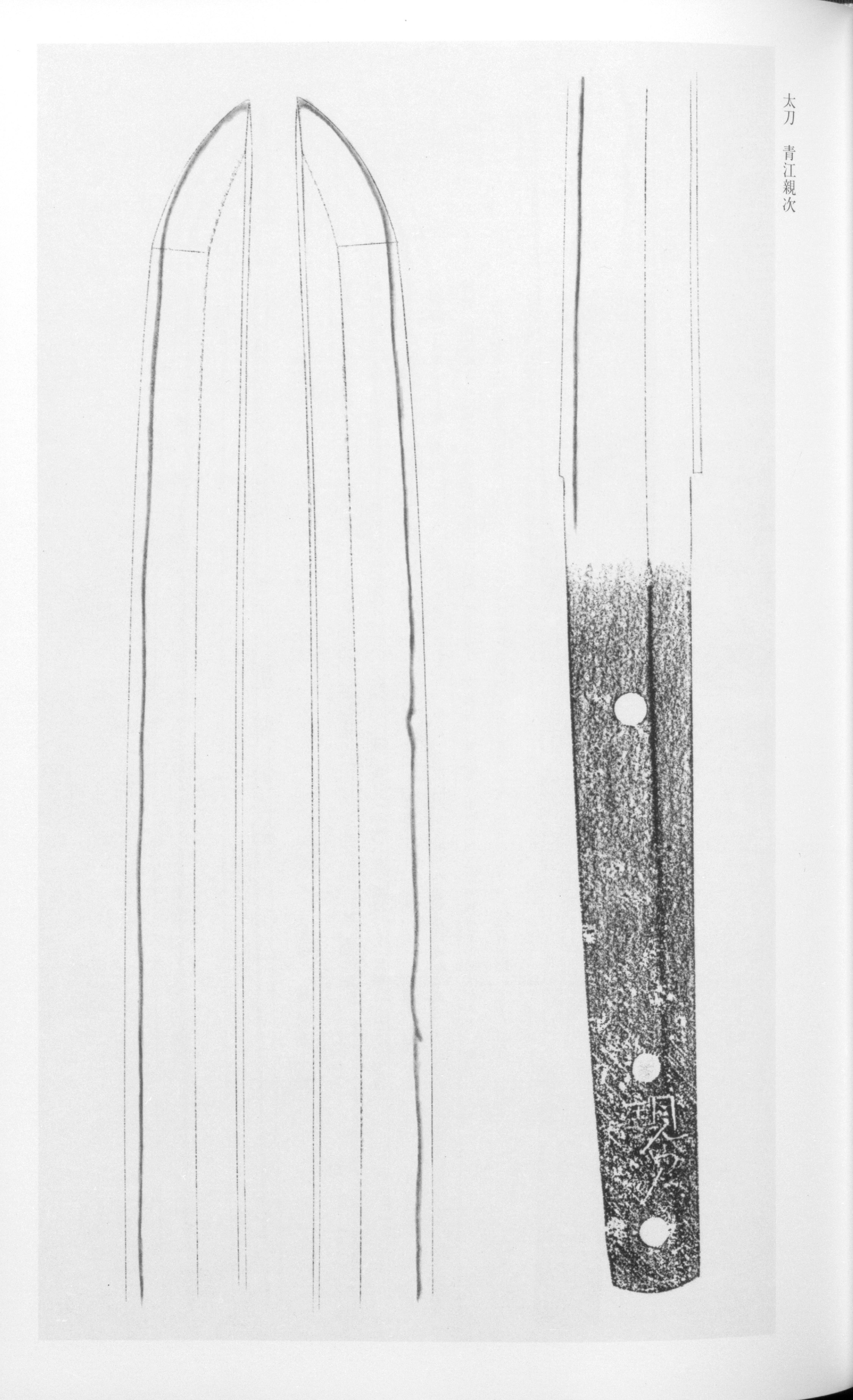 The forging of Chikatsugu's blades displays the school's distinctive traits in pronounced clarity. The characteristically develops a — the fine, crepe-like standing grain that is a hallmark of the group — while adheres and appears throughout. is observed on works of broader proportions. The is fundamentally , a straight temper base into which small-pattern elements such as , , and are mixed, with , , , and entering the temper. The tends toward tightness with , and on larger works the deepens above the . Blades of the later generation present a commanding, dignified shape (-gara) with wide , , and , while shortened earlier-generation works retain orthodox proportions and well-balanced form.