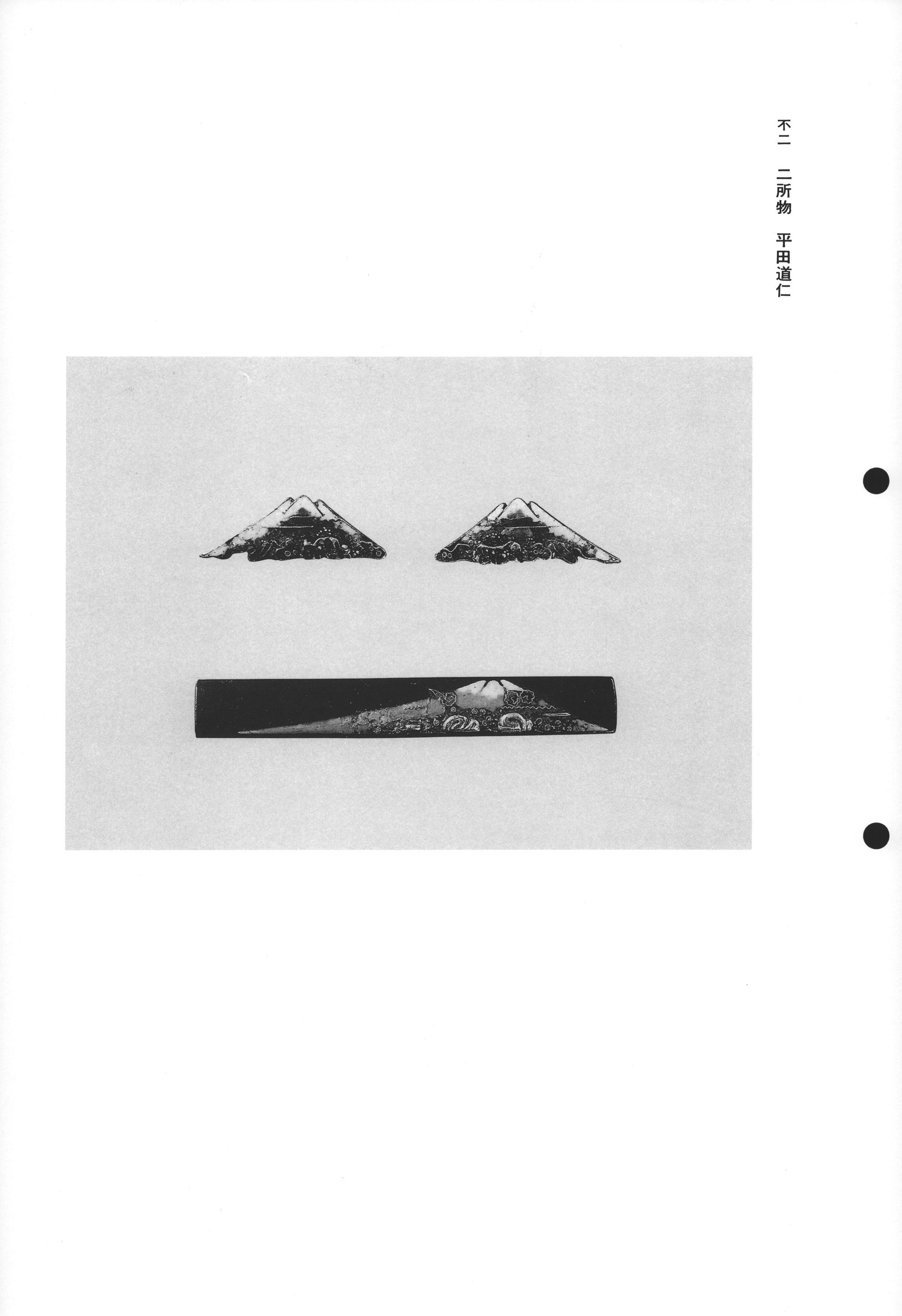 Among metalworkers who expressed the sumptuous, luxuriant beauty of art in sword fittings, Donin is a figure whose importance cannot be overlooked. His primary medium was shippo- (cloisonne inlay), executed through gold-wire cloisons---termed -sen shippo---fused with richly saturated enamels onto grounds, most frequently the jet-black (polished ground). His favored subject was Mount , which he rendered repeatedly with striking variation: compositions expressing the four seasons, depictions of dawn, midday, and evening light on the mountain, and arrangements pairing the peak with auspicious motifs such as deer or gold-and-silver ornament at its base. Beyond the theme, he produced outstandingly decorative works featuring (assorted treasures), bird-and-flower patterns, and boldly scaled kaburaya (whistling arrow) designs. His technique also encompassed (high-relief carving), - (flush inlay), and polychrome metalwork incorporating gold, silver, and inset jewel-like elements of red and deep indigo. A rare signed bearing the inscription "Hirata Hikoshi " demonstrates that his gold - and rounded, abundantly modeled contours were consistent across both his cloisonne and non-cloisonne productions.