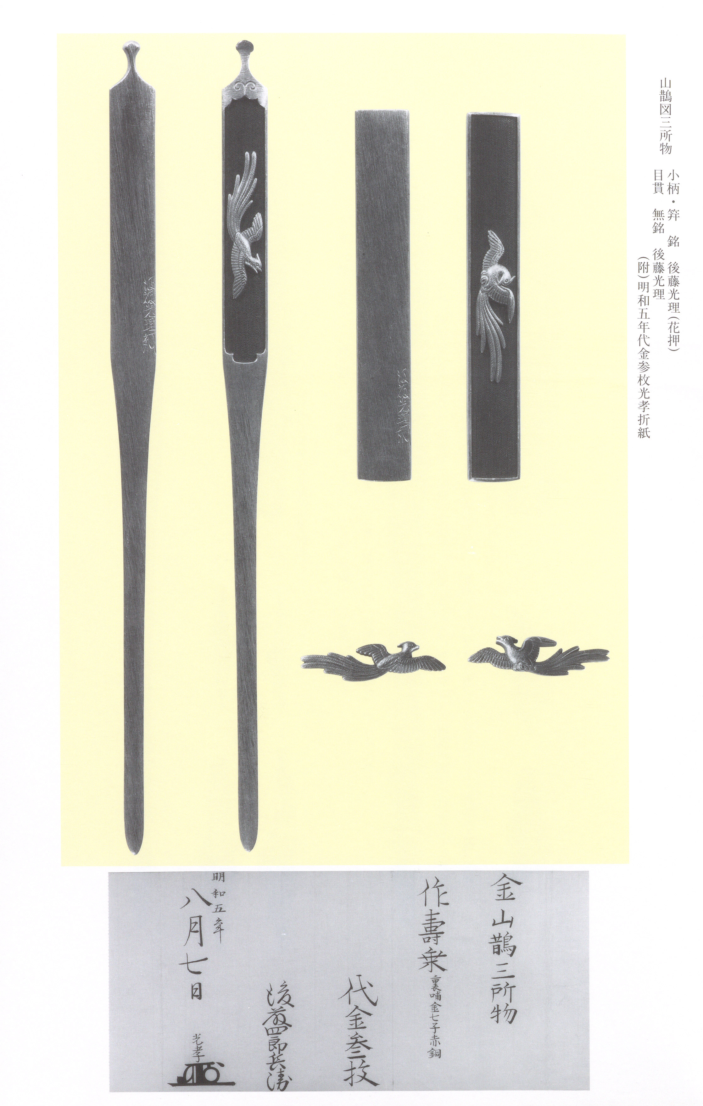 Goto Jujo Mitsumasa, also recorded as Kojo Mitsusato, was born in Genroku 2 (1689) as the legitimate son of the eleventh main-line master, Tsujo Mitsuhisa. His childhood name was Kameichi, and he later used the name Mitsuyuki. In the eleventh month of Kyoho 5 (1720), upon his father's retirement under the name Tsujo, Mitsumasa succeeded to the house, assumed the style Shirobei Mitsumasa, and became the twelfth head of the Goto main line. In this capacity he served not only as a master metalworker but as the principal appraiser and certifier of works by earlier Goto generations, issuing of considerable authority.
