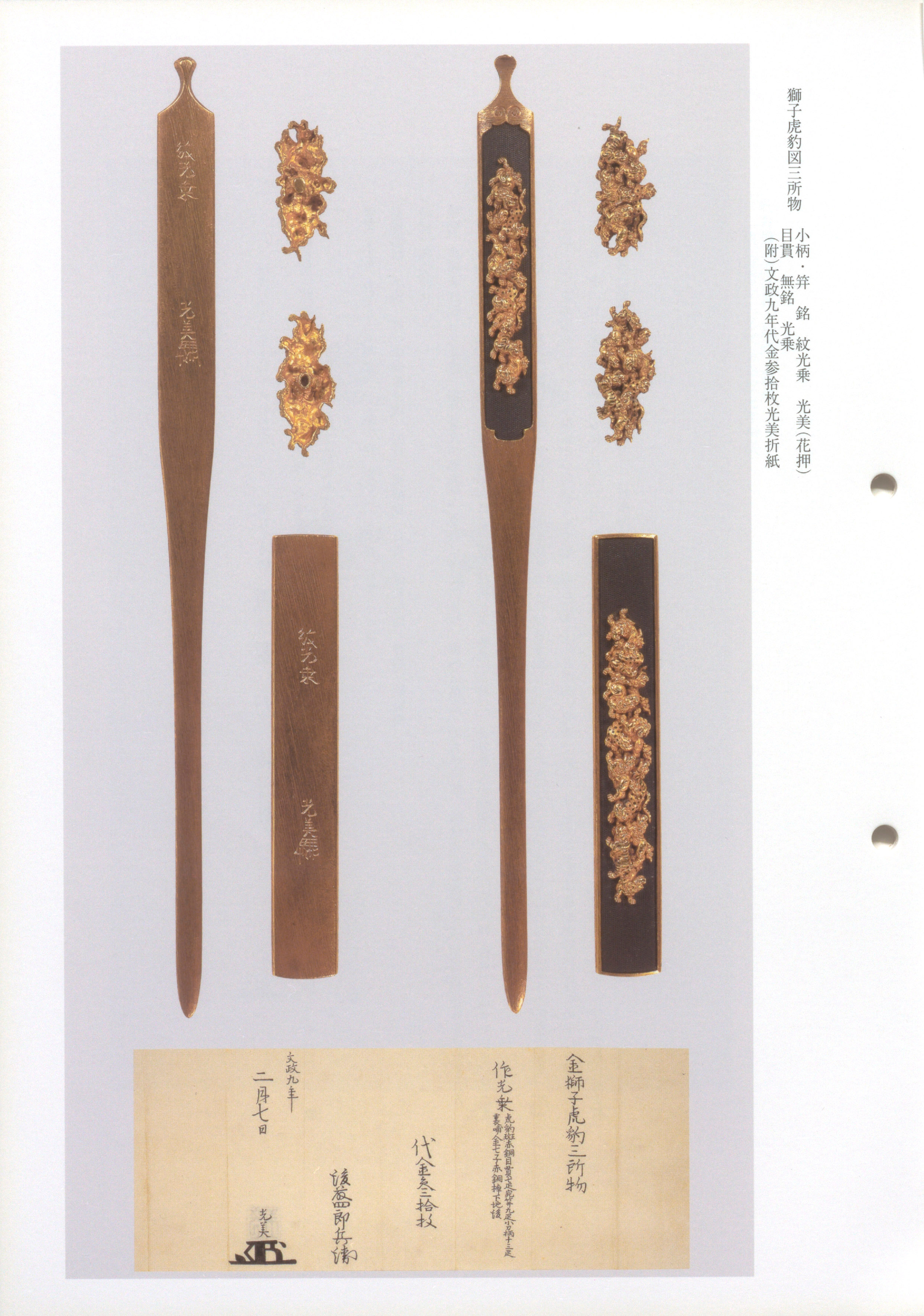 Mitsunori's works embody the spirited luxury of the age while maintaining the dignified tone of the iebori tradition. His subjects range from sacred beasts (reijū) — lions, tigers, leopards, kirin, rhinoceros, and baku — to Chinese historical narratives such as Huang Shigong and Zhang Liang and literary themes from the Twenty-four Filial Exemplars, as well as the Dragon and domestic subjects including oxen and pheasants. Many of his pieces were subsequently authenticated by later mainline masters, most notably the thirteenth head Mitsutaka (光孝), who inscribed authentication marks () and issued certificates with valuations that rank among the highest class. These works were transmitted through distinguished collections including the Shimazu, Kōnoike, Tsugaru, and Sakai families, attesting to the esteem in which Mitsunori's craftsmanship has been held across centuries of connoisseurship.