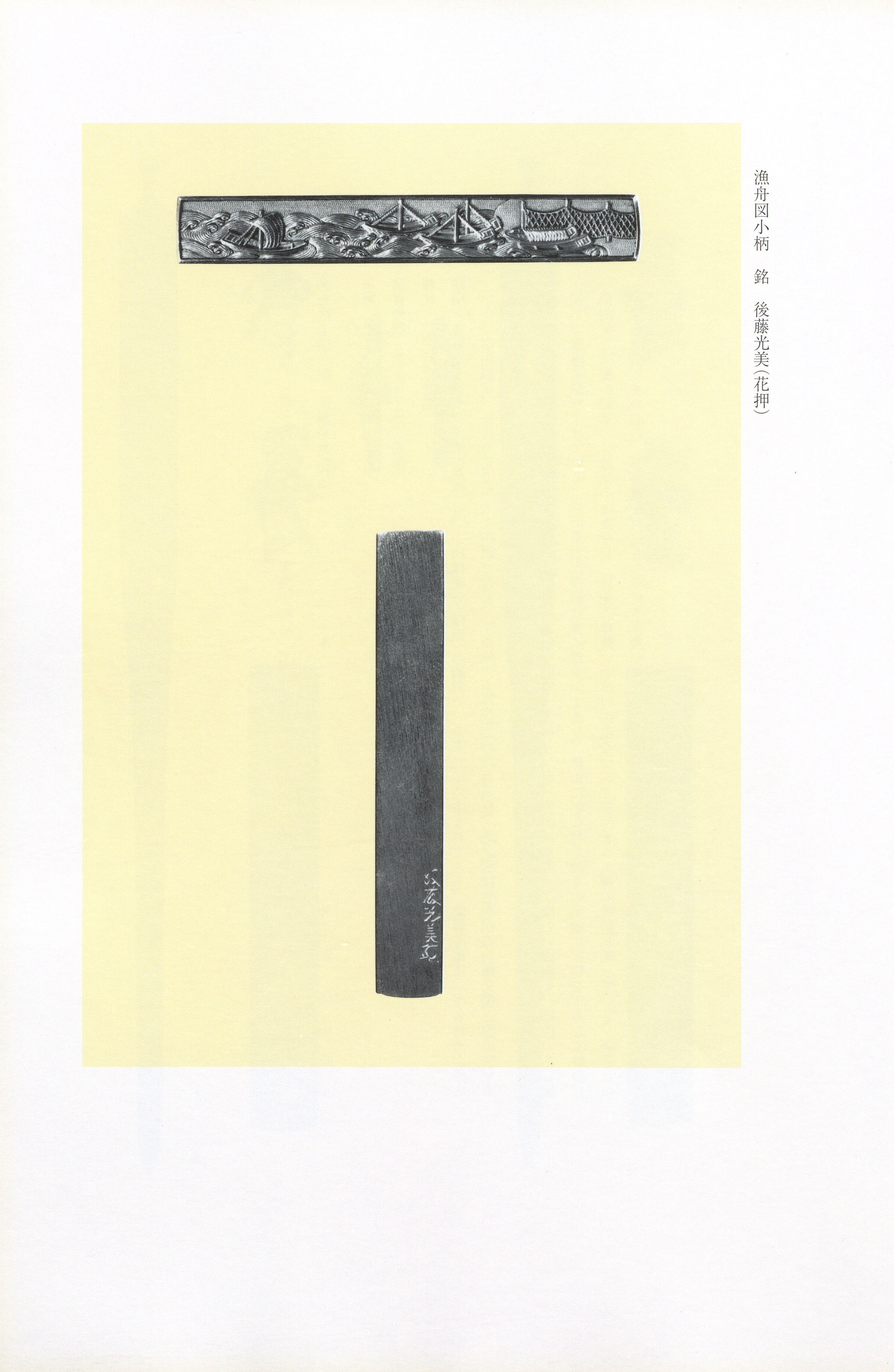 Mitsuyoshi worked squarely within the traditional Goto manner -- (high-relief carving) with (polychrome metal inlay) on a ground -- yet brought to it a pronounced lyrical sensibility and assured command of composition. His subjects encompass sweeping landscape programmes such as Mt. and the Tokai seacoast, rendered across complete soroi- suites, as well as intimate seasonal themes of autumn grasses with the moon rabbit. A solid-gold depicting a seashore scene demonstrates his capacity for chisel work of pronounced modulation and rhythm, rendering form and recession using gold alone with truly delicate precision. Notably, he extended the Goto idiom beyond sword fittings by producing signed inro and netsuke in , an uncommon material choice for the house, conceived as coordinated ensembles reminiscent of a warrior's formal attire.