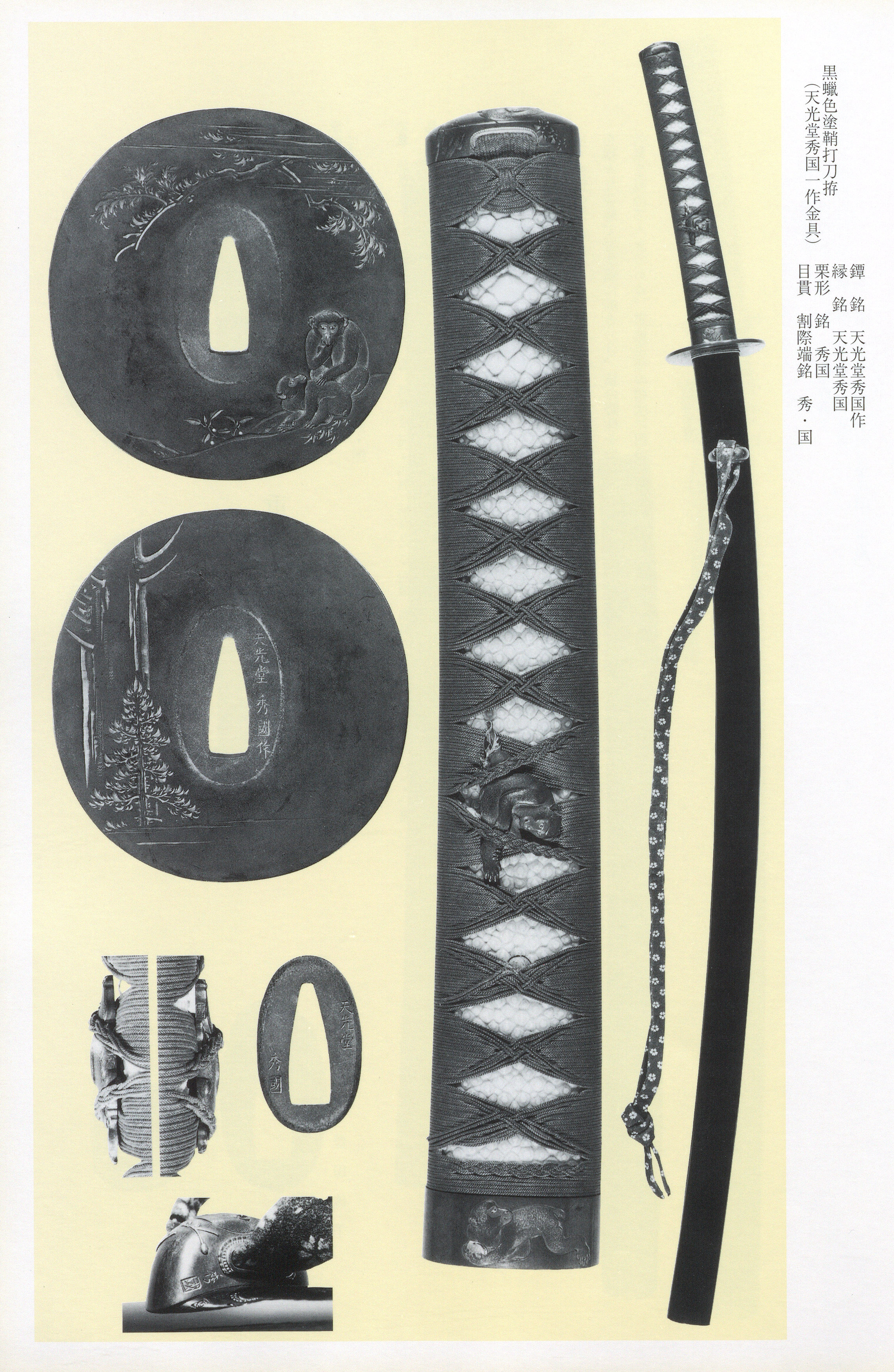 Hidekuni particularly excelled in (high-relief carving) executed with skillful deployment of various alloys, and he was also highly proficient in (fine line engraving) and (single-bevel line carving). His subjects range from animals and plants rendered with a strong devotion to direct observation to figures and landscapes, all conveyed with the tasteful charm characteristic of the Otsuki manner. His technical command is evident in unified suites where he freely varies depth and shallowness in smooth high relief across iron, polished , and solid gold grounds, deploying , , and in gold, silver, , and to achieve meticulous polychrome effects --- from the venerable faces of arhats down to each plant, animal, and implement.
