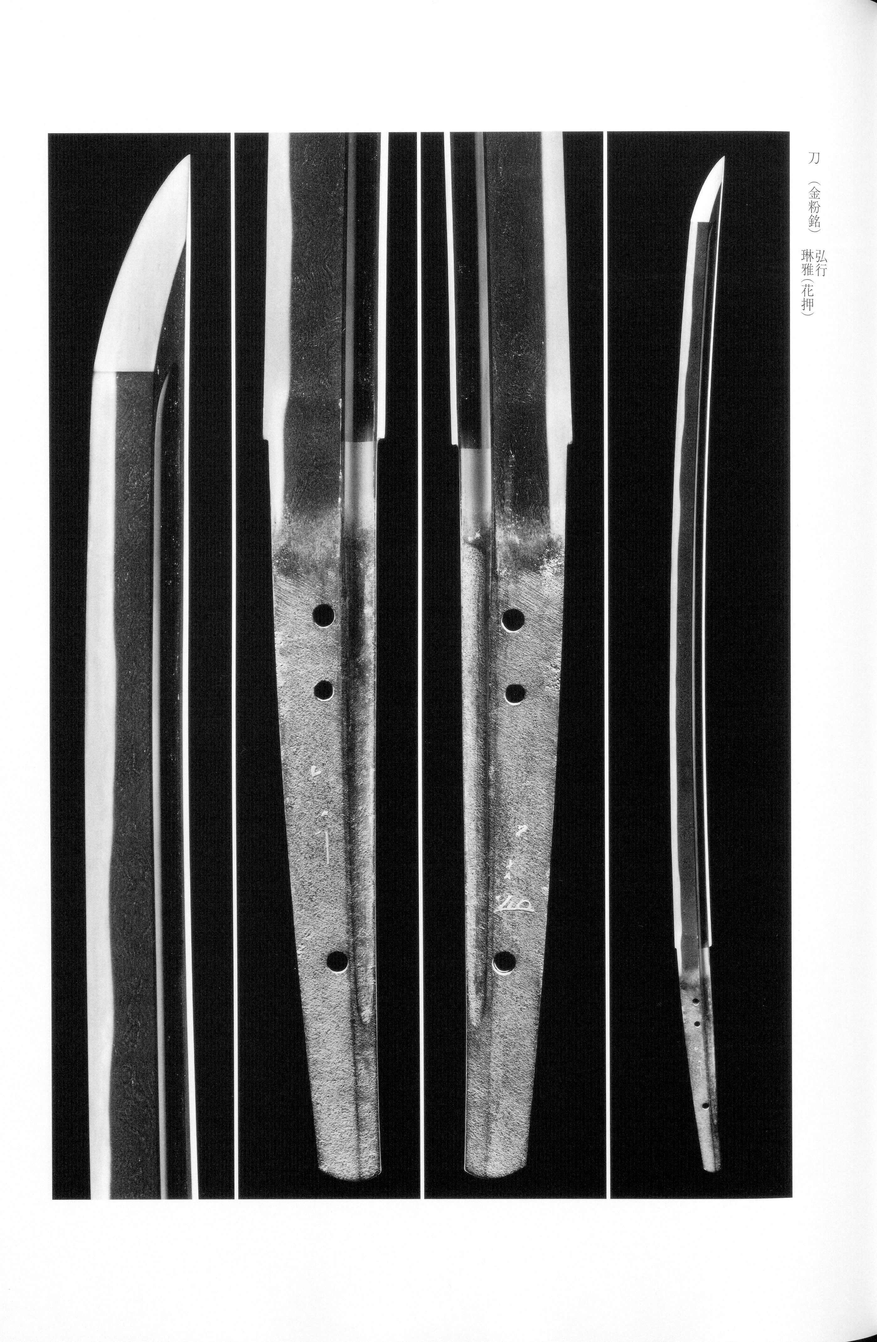 Hiroyuki's works display the bold, imposing characteristic of the mid period: wide with little difference between base and tip widths, shallow , and , presenting a grand and powerful silhouette. The is typically mixed with and , with the grain tending to stand; thick adheres and enters well, while the steel often shows a somewhat darkish tone with a slightly whitish tendency. The is characteristically based on or shallow , into which are interwoven , , , and ; the is deep with thick that may include patches of somewhat coarse producing an uneven effect. Throughout the tempered area, conspicuous and run vigorously, and the frequently shows a tendency. The typically enters with a slightly pointed tendency at the tip and displays vigorous . A faint may also be observed. Compared to other smiths, Hiroyuki's tempering tends toward a relatively restrained irregularity in which the rises and falls of the do not stand out strongly, at times showing a manner that serves as a distinguishing point of attribution.