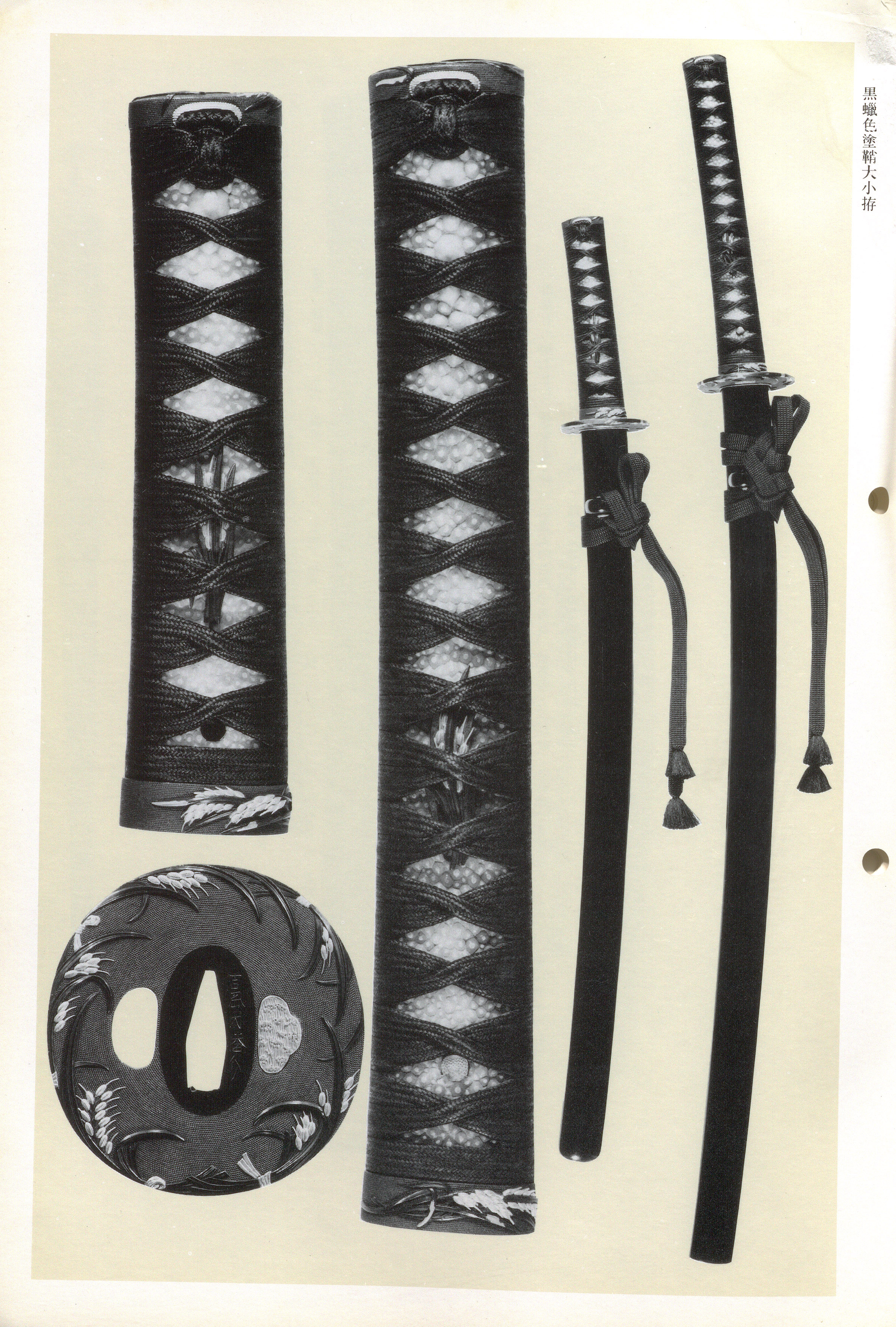 The Yoshioka school's characteristic manner centres on enhanced with (high-relief carving) and (gold colour inlay), producing workmanship that is solid and precise. Their steady, reliable carving is paired with meticulously applied using many kinds of coloured metals, yielding surfaces that, while sumptuous, remain filled with dignity and refinement. Compositions range from the Eight Views of Omi rendered in polychrome , to dragon-and-tiger programmes deployed across complete -soroi suites, to the restrained formality of ripened rice ears (inaho) unified across matched mountings. Techniques of -sue- (gold applied motifs) and (gold inlay) are employed to achieve striking contrasts between flat inlay that conveys the momentum of a brushstroke and higher-relief applied decoration.