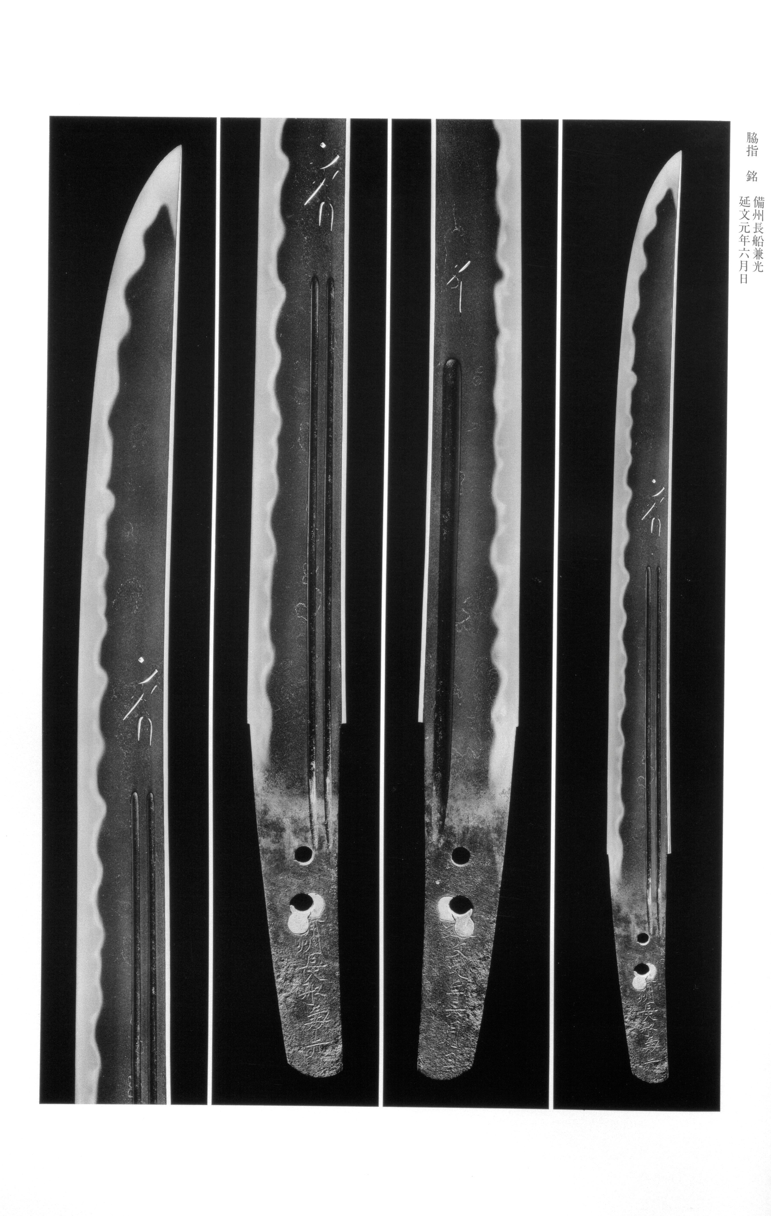 The early-phase tempering tends either toward a -based style mixed with , or toward in a -like manner. These works closely resemble the production of Kagemitsu and reflect an inherited orthodox sensibility. From the Jōwa and Kannō eras, Kanemitsu's blade forms take on the grand and robust characteristic of the period — wide with little difference between base and tip width, shallow , and boldly formed . The shifts to a broad, relaxed mixed with , , angular elements, and occasionally , with and entering vigorously. The work is predominantly or with adhering, and fine and run throughout. The is characteristically bright and clear. The shows mixed with , with extremely fine adhering thickly, delicate , and vivid standing out — the steel described repeatedly as bright and clear (). The typically enters in , often becoming pointed with , and turns back in a manner that projects considerable strength. A further distinguishing feature is the orderly composition of and running in sequence from base to tip, a construction the identifies as among Kanemitsu's particular strengths. of appear frequently, and the "grass" carving is noted as something occasionally encountered among the -period mainline, particularly on works by Kanemitsu and Tomomitsu.
