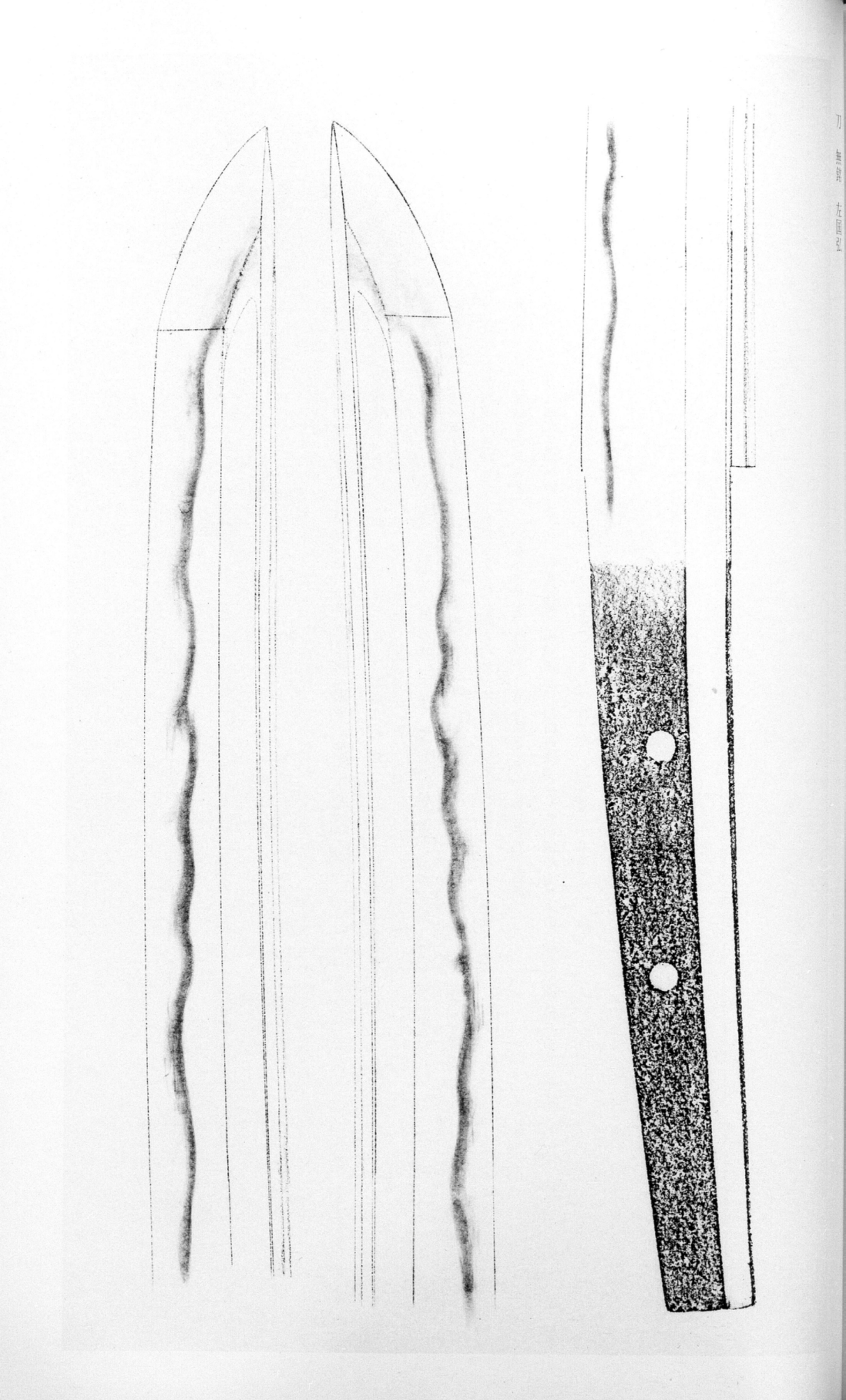 The technical hallmarks by which Kunihiro is identified within the group center on a characteristic moist, soft quality — — pervading the , and a somewhat vigorous overall construction. The forging shows mixed with , the grain tending to stand out (), with adhering and entering frequently. The ranges from mixed with to larger patterns in with ; runs freely and intermix, while adheres well and clusters of may appear in places. The bosshi characteristically rises — a tendency — becoming sharp and pointed with , a feature that, even within the broader group, is appraised as pointing specifically to Kunihiro. Blades in full form display wide , shallow , and , often with construction.