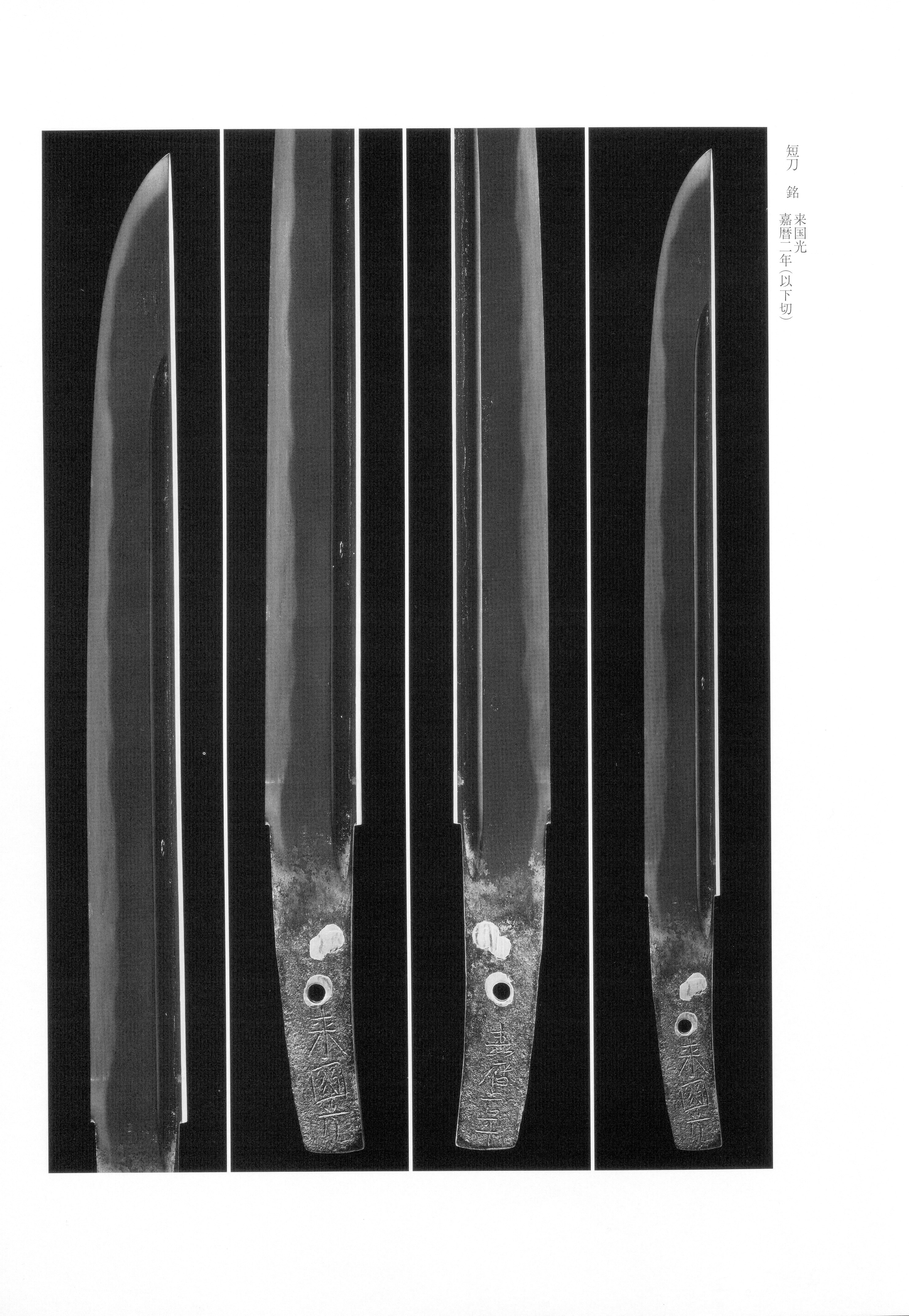 Kunimitsu (来国光) is, according to the prevailing view, transmitted as a son of Kunitoshi, the patriarch of the school in Yamashiro Province. He was active from the closing years of the period into the early period. Among extant works bearing production dates, the earliest is Karyaku 1 (1326) and the latest is Kanno 2 (1351). Because of the length of this working span, and because of changes observable in both style and the forms of the characters in his signatures, some argue for the existence of a first and second generation; however, a strong opposing view interprets these differences as reflecting only changes over the course of a single individual's lifetime, and the matter remains one that should await further study. Within the school, many examples of his work survive, and he is regarded as the most versatile smith within the lineage, demonstrating the broadest working range. Among the signatures of the Karyaku and Gentoku years, the character forms have a softness, with the enclosing characteristically rounded; by contrast, those of the Jowa and Kanno years show a somewhat harder impression, with the enclosure becoming more angular.