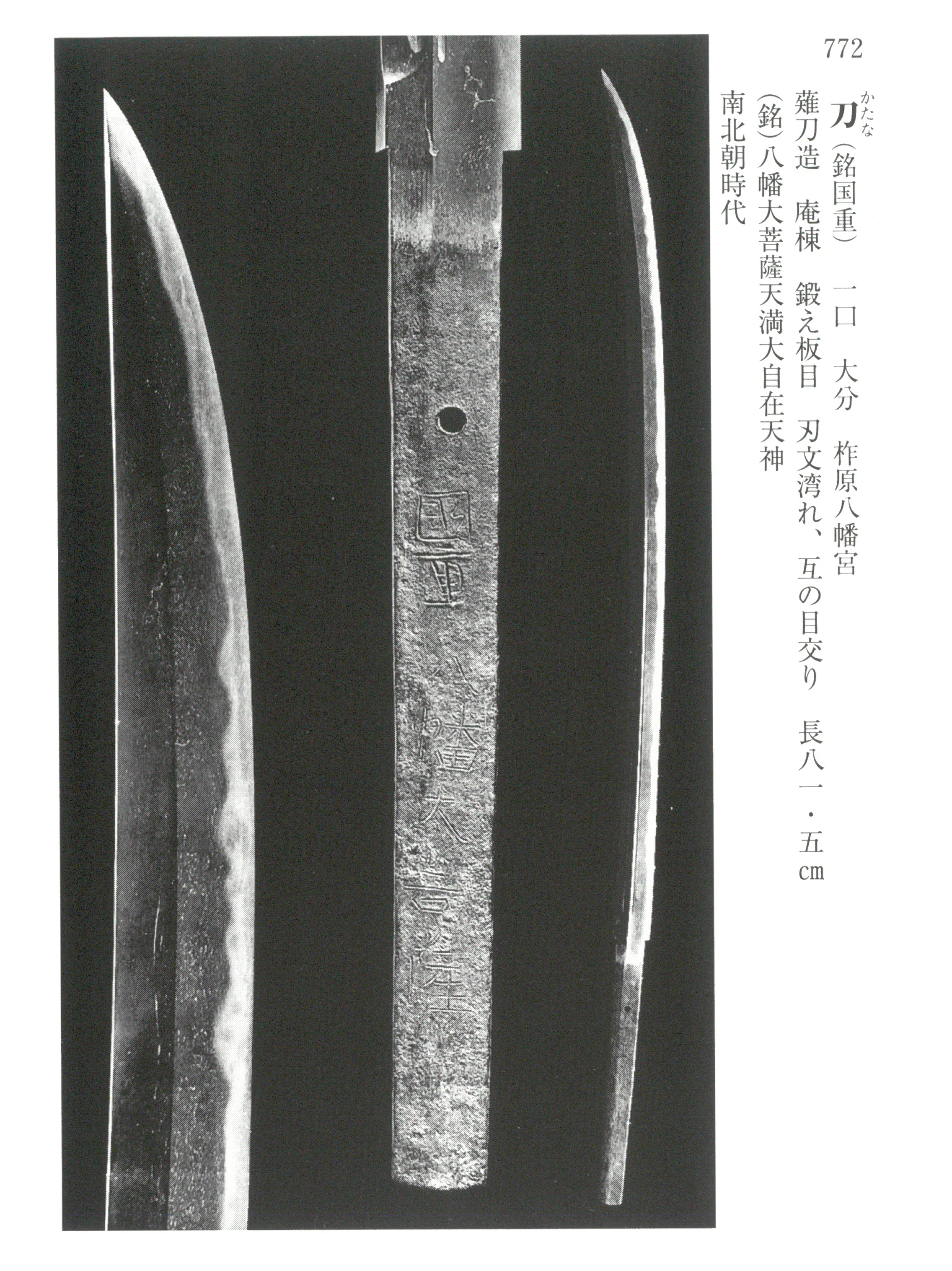 Kunishige's signed works display without reservation the distinctive features of the Hasebe school, and his carvings, though simple, are executed skillfully. His blades demonstrate both the characteristic mode and quieter stylistic variants, attesting to the range of his artistry within the broader -influenced Yamashiro tradition of the period. The signature itself, cut with a somewhat thick chisel in five characters, serves as a model example of the first generation's inscription and constitutes important reference material for attributing unsigned works within the Hasebe lineage.