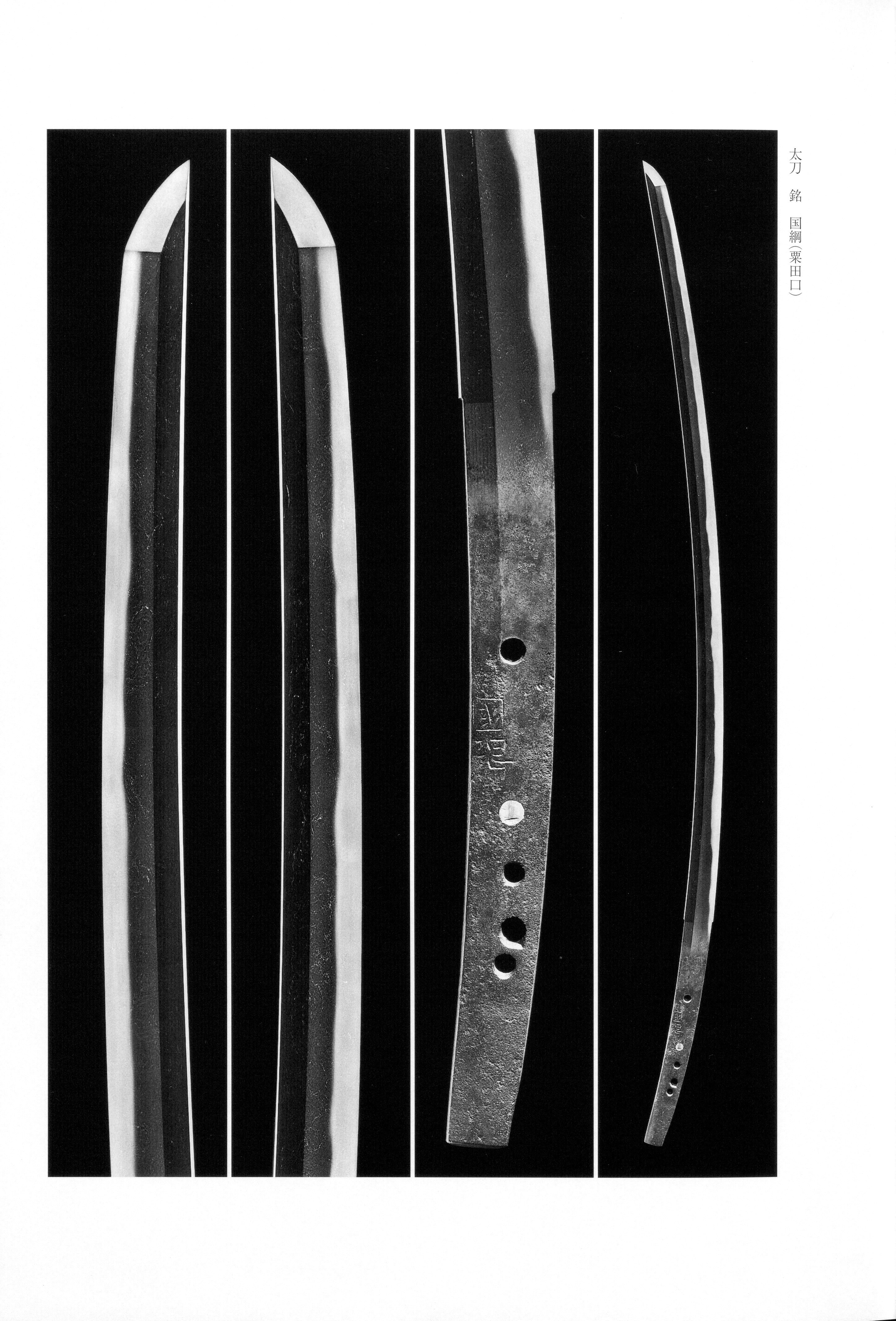 works are generally characterized by a serious and refined elegance, yet Kunitsuna alone is distinctive within the group. His shows pronounced without the blade assuming a drooping tendency toward the tip. The forging displays comparatively large with a strongly standing and thickly laid , frequently accompanied by and, in many instances, a -like that appears below the . His tends to be broad in , with a foundation into which , , and shallow are intermingled; thick and enter vigorously, the is distinctly deep, and within the temper forms both deeply and thickly. , , and are interwoven throughout, producing richly varied . The manner in which both and are vigorously animated is precisely the hallmark of his art, and the conspicuous strength of the stands out as a defining trait that separates his work from the quieter, more restrained character of his brothers.