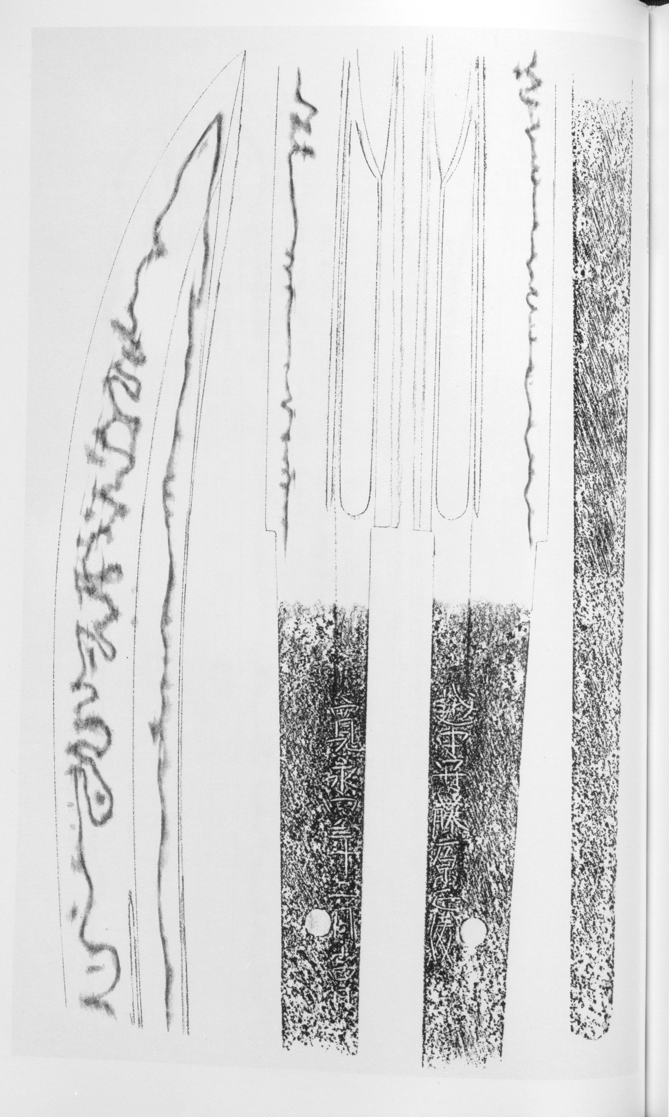 Masatoshi's forging is an with a tendency to flow and areas where the grain stands out, showing abundant and . His demonstrates the breadth of workmanship for which he is celebrated: a base mixed with , , , and -like forms, with occurring frequently and vigorous and applied throughout. The is strong and conspicuous. A hallmark of the lineage is the - -- a that enters in , becomes pointed at the tip, and turns back -- and the observes that it is Masatoshi who expresses this feature "with particular clarity." Where many works of this lineage tend toward a somewhat subdued , Masatoshi's examples are singled out for their bright and clear quality, described as .