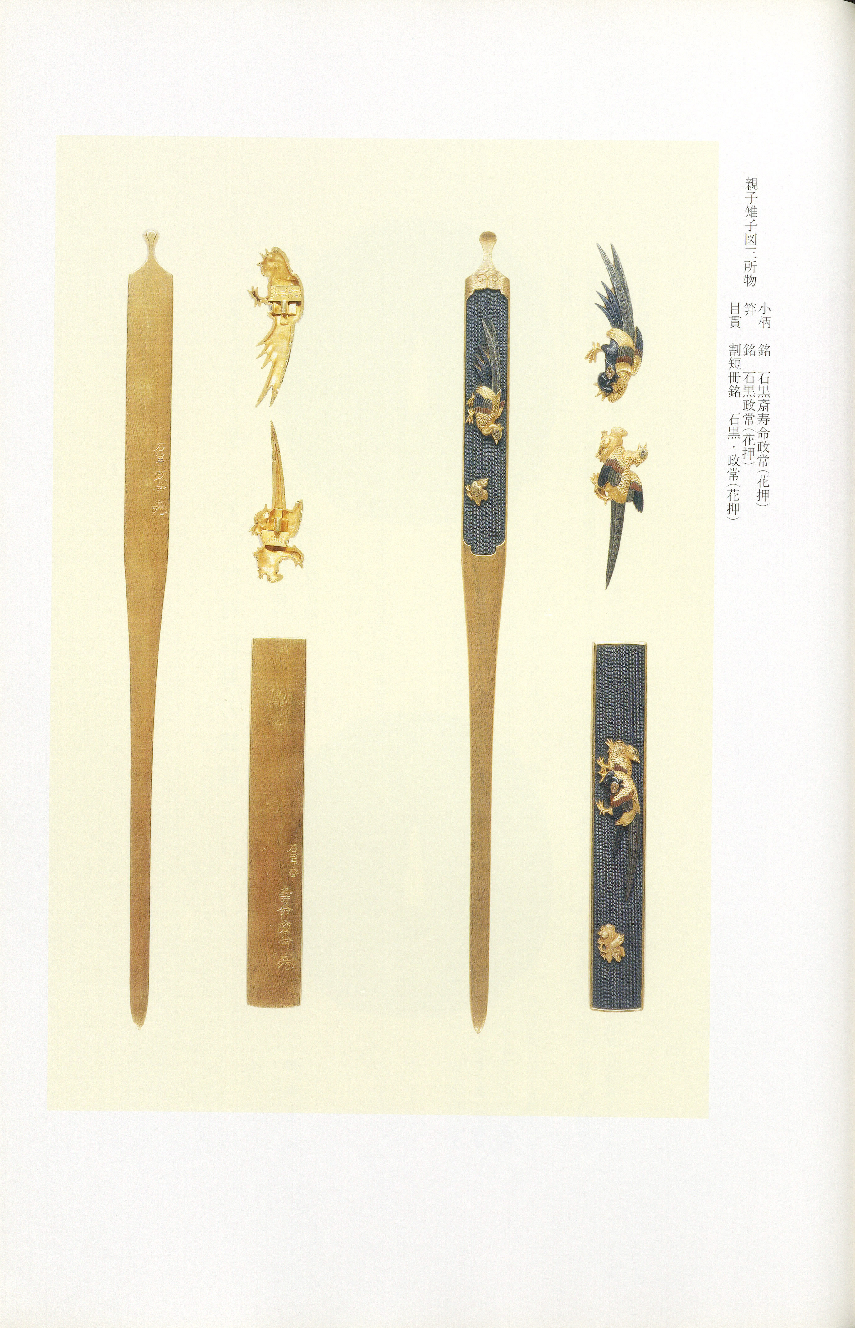 Masatsune's artistic significance rests upon his transformation of the Yanagawa manner into a distinctly personal idiom centered on bird-and-flower subjects and birds of prey — themes that became the hallmarks of his school. His compositions make masterful use of open space, creating what the examiners repeatedly describe as a "clear and limpid spirit." Yet within this decorative brilliance there persists a martial vigor suited to warrior taste, a quality that distinguishes the first generation's work from the more purely ornamental output of later Ishiguro artists. His oeuvre spans , , , , , and complete soroe- sets, demonstrating equal facility across every format of sword fitting. As an artist who bridged the Yokoya lineage's classical discipline and the expressive naturalism of the Bunka-Bunsei cultural efflorescence, Masatsune stands among the foremost representative metalworkers of -period Japan.