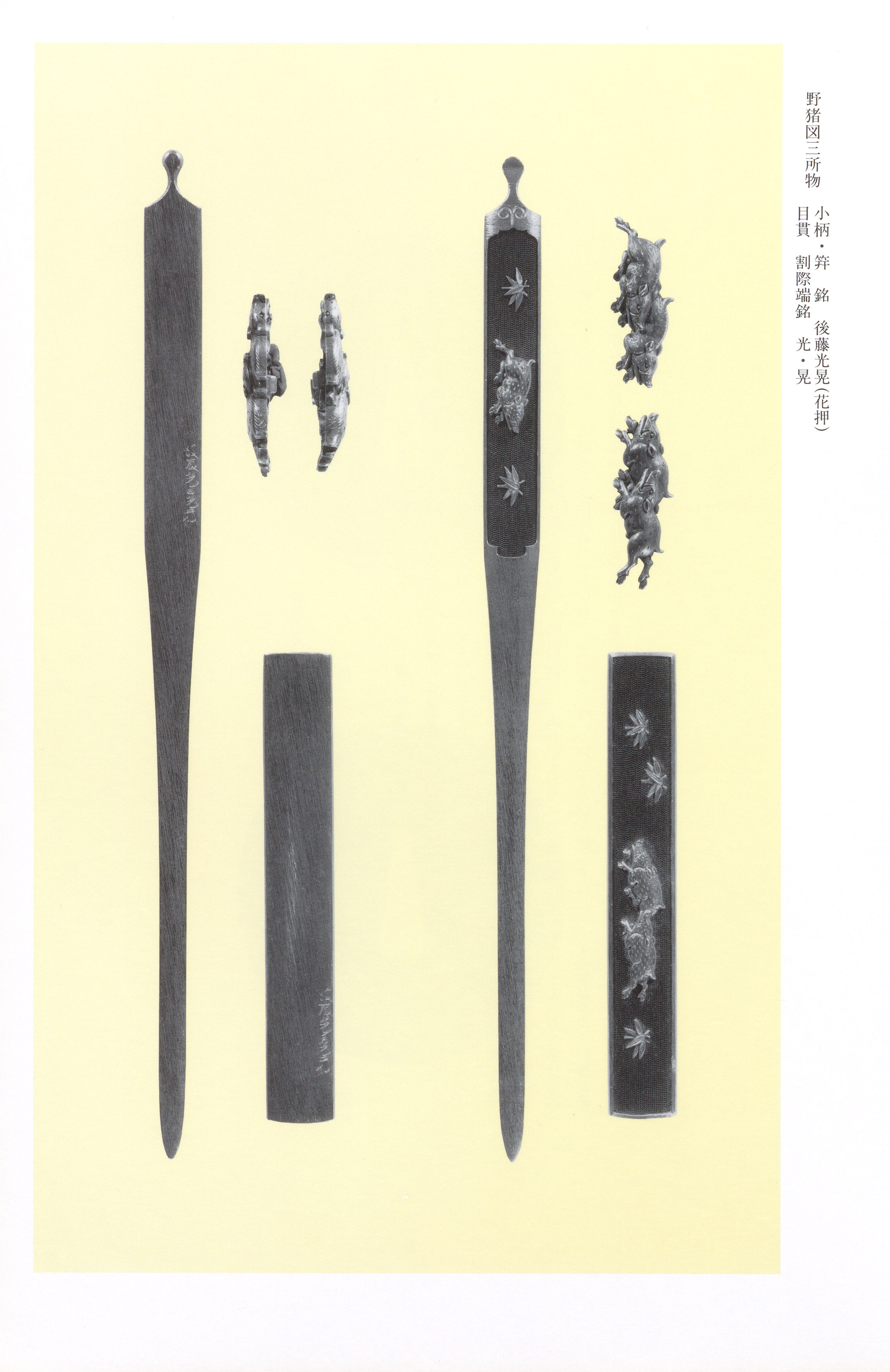 Mitsuaki's oeuvre is distinguished by an unwavering commitment to the Gotō house carving idiom (iebori): and finely controlled on grounds, with ' gilded backs — the canonical techniques of the mainline tradition executed to an exceptional degree of finish. His chisel work is characterized by "high mountains and deep valleys," imparting vigorous movement and energetic momentum to figural subjects, while his compositional sense favors ample open space rendered with "straightforward sincerity." The repeatedly note his "rich, dense manner" and the "delicacy and richness" extending even to facial expressions. Chromatic planning is a hallmark: beyond painstaking gold and silver , he employs with deliberate effect to introduce what the terms a "rustic, natural flavor" (yashū). His and are constructed by the jiita inlay-fitting method with characteristically long warabite feet, and the reverse of his is finished with thick gold backing (atsugane-dashi). Several observe the influence of (town-carver) aesthetics and the "brilliant, decorative manner favored from the late period into the Bakumatsu era," suggesting what the calls "a new style of official Gotō carving" emerging after the family's long establishment in .