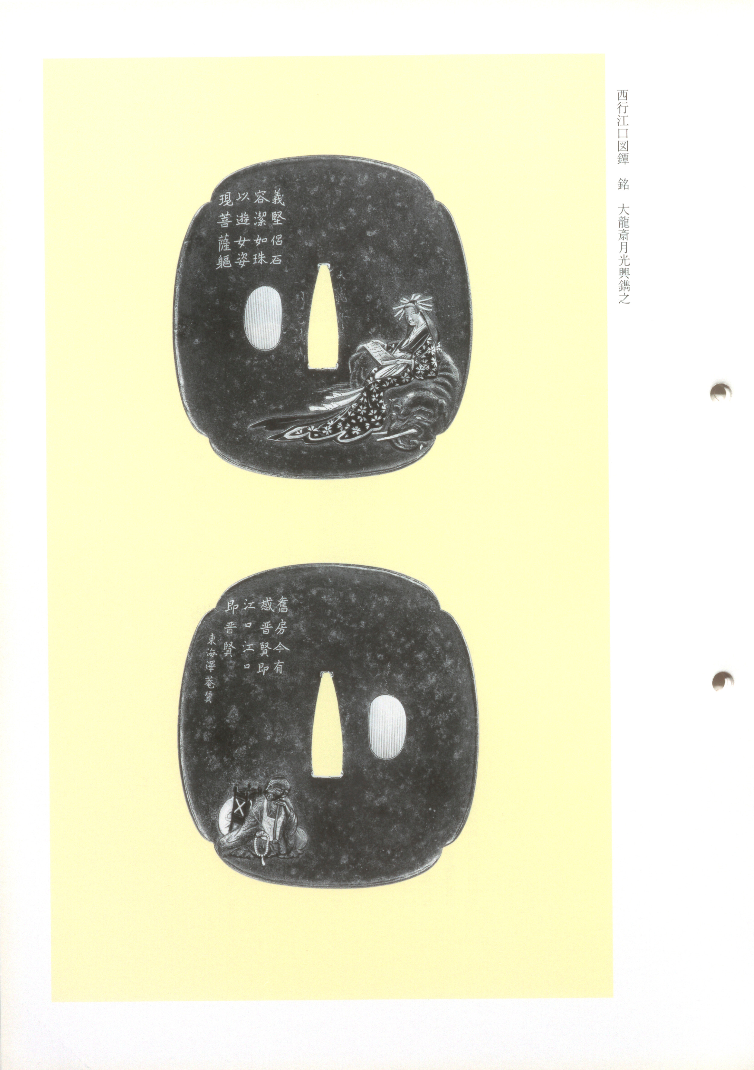 Otsuki Mitsuoki was the son of Mitsuyoshi, the third-generation master of the Otsuki school -- a lineage the consistently identifies as "a distinguished lineage among the Kyoto metalworkers." He was born in Kyoto in Meiwa 3 (1766) and died in Tenpo 5 (1834) at the age of sixty-nine. He studied painting under Kishi Ganku and is said to have maintained close ties with Nagasawa Rosetsu, associations that decisively shaped what the examiners describe as an artistic manner that is, "in the truest sense, painterly." He employed a profusion of art names -- Ryusai, Dairyusai, Ryukomado, and Shiryudo among them -- and signed in varied forms including "Yoshu Mitsuoki," "Gekko Mitsuoki," "Tsuki Mitsuoki," and "Mitsuoki" written with variant characters. His works uniformly bear a tripod-shaped seal (kanae-in) as an impressed mark.