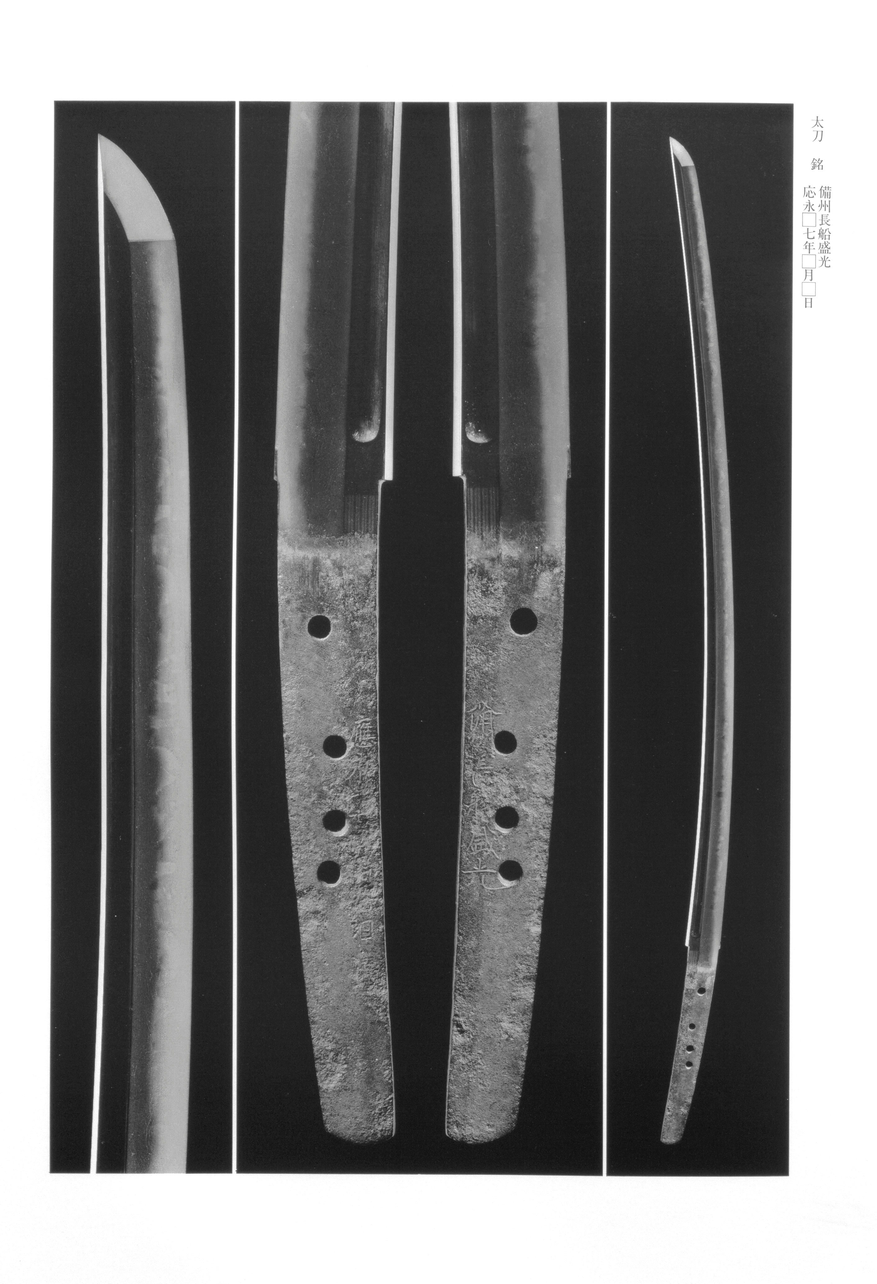Morimitsu's significance rests not only on the consistently outstanding quality of his workmanship but also on his role in establishing the aesthetic vocabulary of Oei-, a style whose influence pervaded early sword production. His finest preserve their original with imposing, deeply curved forms that convey the grandeur of an earlier age, while the internal activities within the tempered edge — vigorous and varied — and the bright, clear quality of the bring forth his true strengths without reserve. Many works are praised for being preserved in condition in both and , and the and devotional carvings frequently applied to both sides harmonize well with the blades, further enhancing their overall impact. His earliest dated pieces, such as the Oei 2 , display a transitional character that bridges the manner of his father's generation and the fully developed Oei- idiom, making them invaluable reference material for understanding the evolution of late medieval forging. Morimitsu's oeuvre thus represents both the apex of Oei- achievement and an essential chapter in the broader lineage of the tradition.