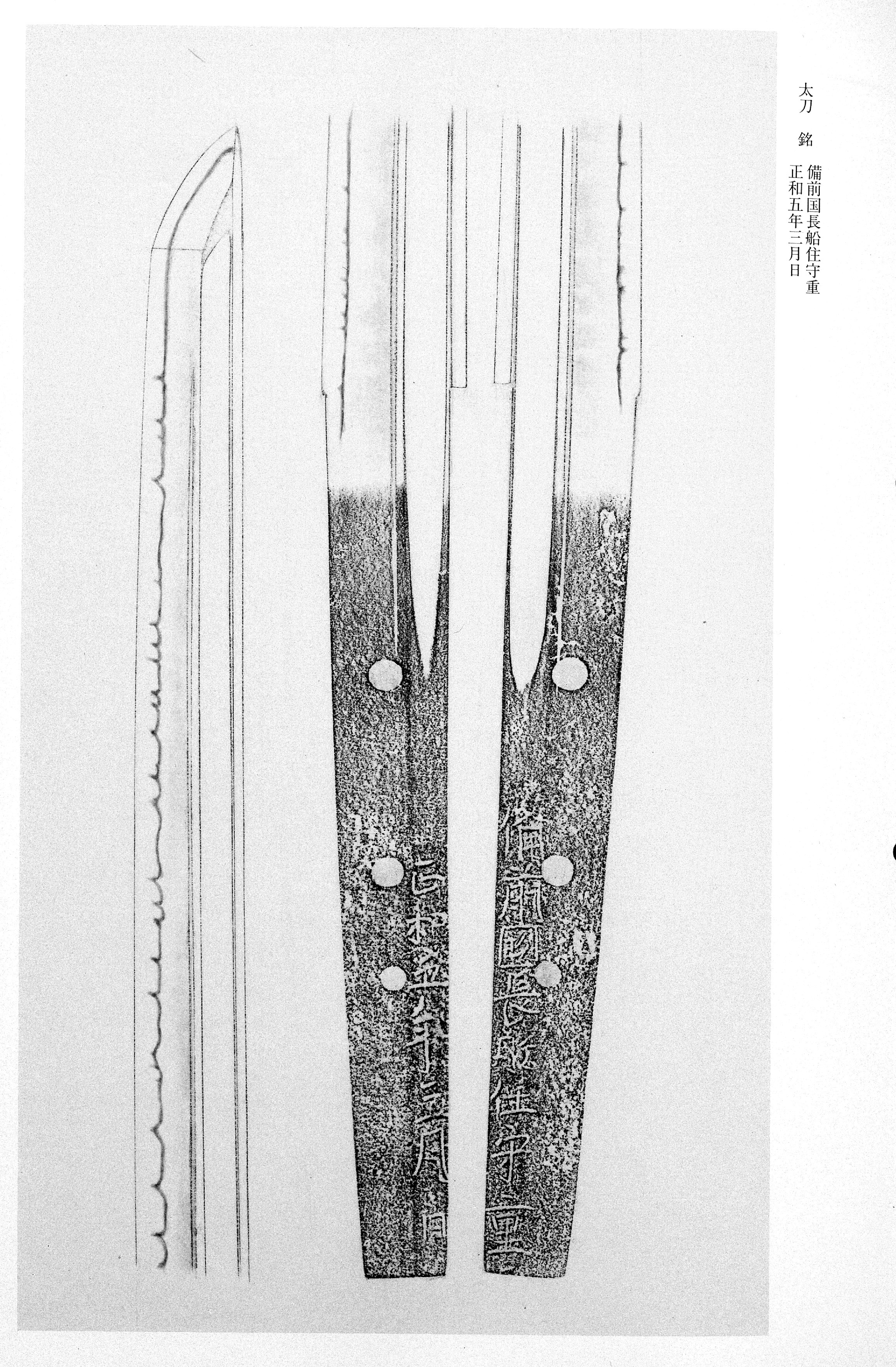 Morishige is traditionally transmitted as a swordsmith of the line within the school. According to the (smith directories), he is recorded as a son of the second-generation Moriie and as the father of Motoshige, with extant dated works bearing era names spanning from Einin and Kagen through Showa, Bunpo, and Gen'o — all corresponding to the closing phase of the period. Distinguishing a first and second generation Morishige is considered somewhat forced; in broad terms he should be regarded as a swordsmith of the late period. Smiths using the name succeeded the founder, and they continued working through the period under what reference works identify as the group, so called because the founder is said to have moved from in Yamashiro. In all cases, however, their signatures state "Bishu -ju" (resident of in Province), making it clear that their place of work remained . The -period generations are recorded from (1368–1375) through to the end of the period, with dated examples surviving from the Oei and Bunmei eras.