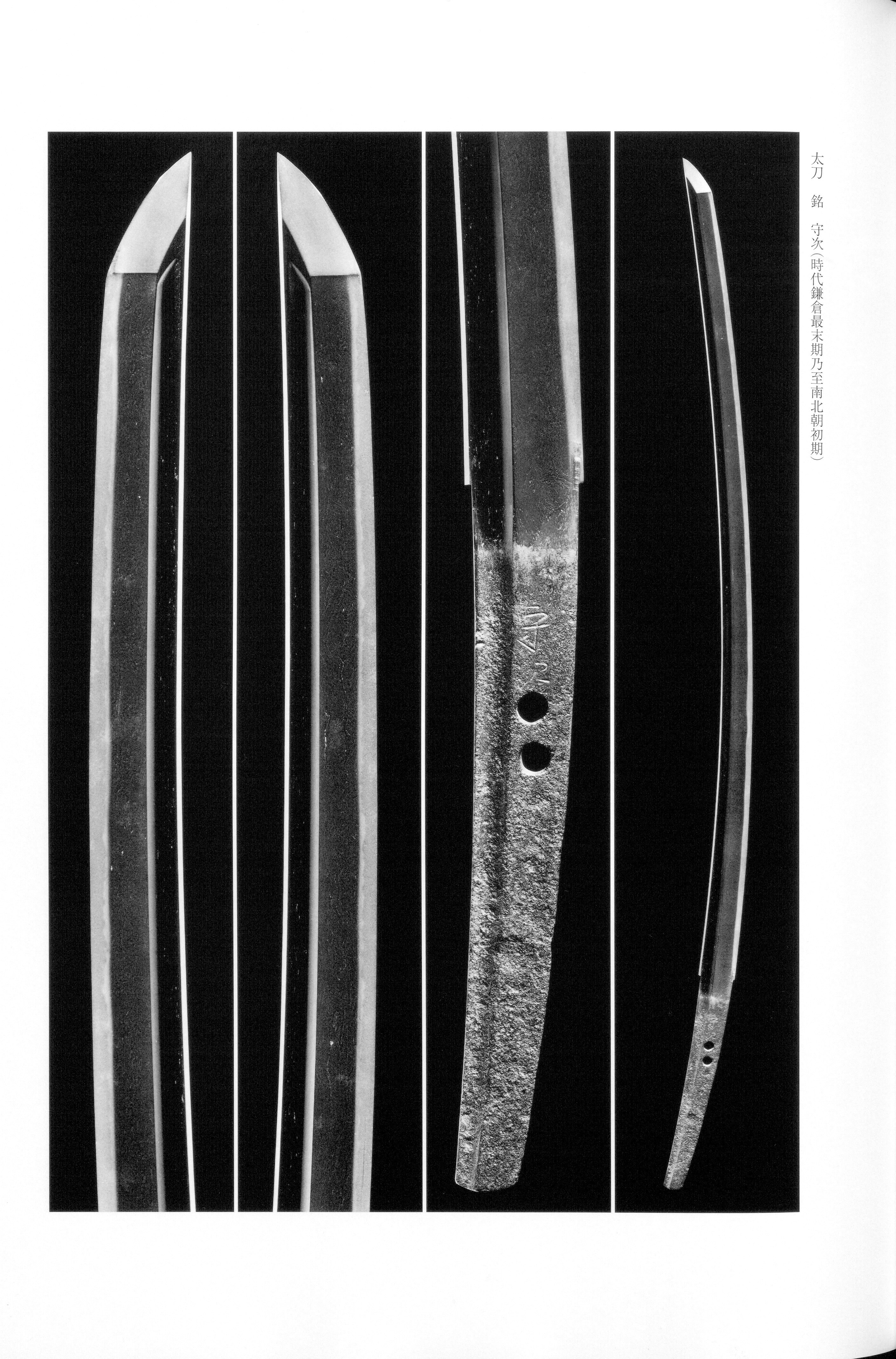 The manner in which a bright, tightly formed is tempered, producing a deep -ai — a "salt-like" depth in the appearance of the hardened edge — is described as superb, allowing one to perceive the high technical ability of Moritsugu. Extant works from the late through early period are rare, and signed examples possess high documentary value as material for the study of both the smith and the school. That the signature on one celebrated is executed in exactly the hand as the Uesugi family's Important Cultural Property known as the Rinpo further attests to his place within this venerable tradition.