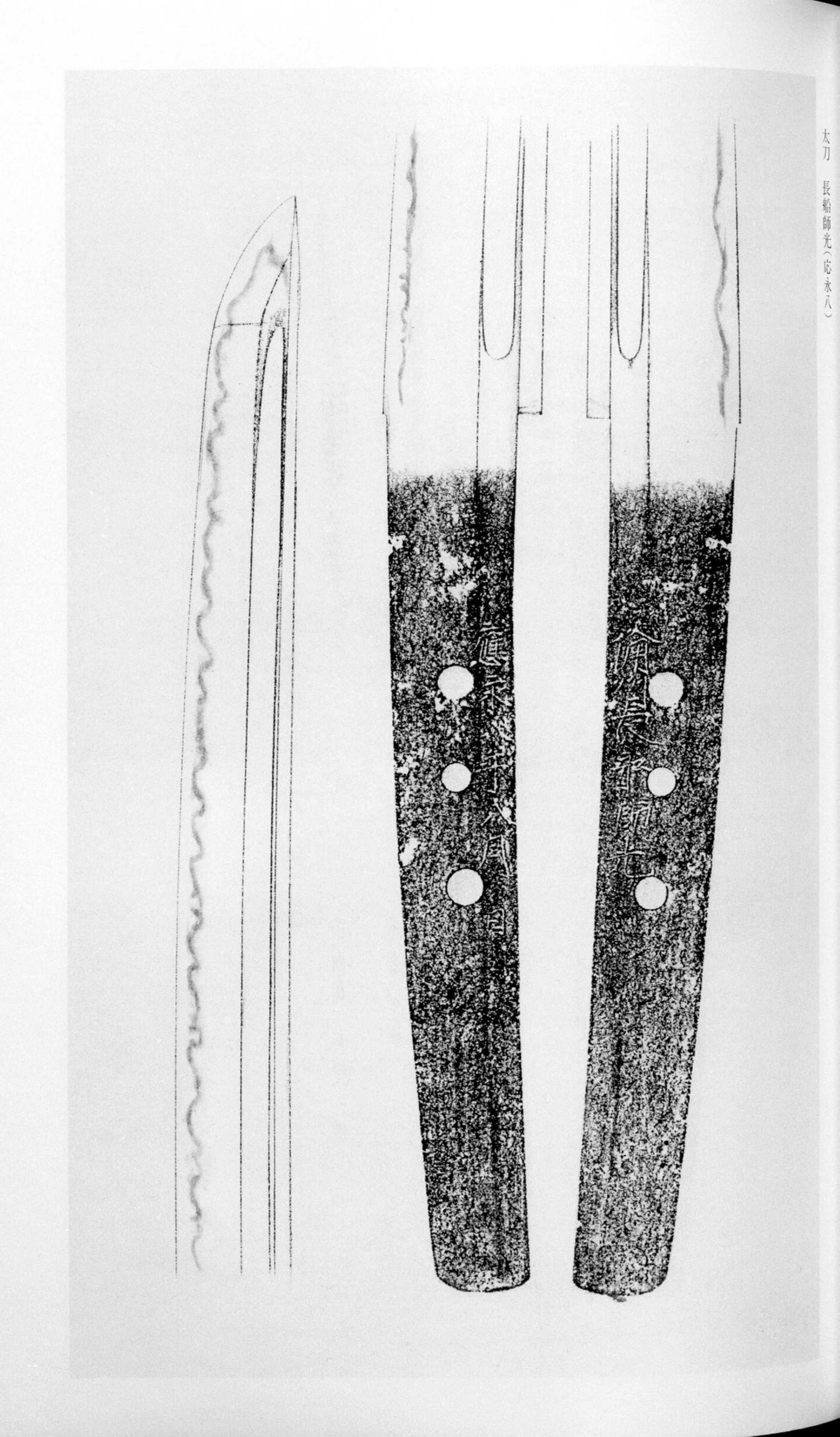 Morimitsu's forging characteristically shows mixed with , , and areas of , frequently exhibiting a (standing-grain) tendency. Within the , dark-toned steel reminiscent of appears, and or faint stands out — hallmarks of the tradition. His typically takes the form of mixed with , , small -like elements, pointed forms, and -like features, with the pattern characteristically opening at the waist (). The tempering is -dominant, with attaching and a inclined toward tightness; fine appears throughout. Compared with the works of the period's height, the overall patterning is "somewhat smaller in scale," and both and present an irregular, complex visual effect that well demonstrates the characteristics of what is termed ko-tanmono (small-pattern work). In certain works, one side displays more flamboyant with pronounced waist-opening, in which the discerns "signs foreshadowing the style of Oei-."