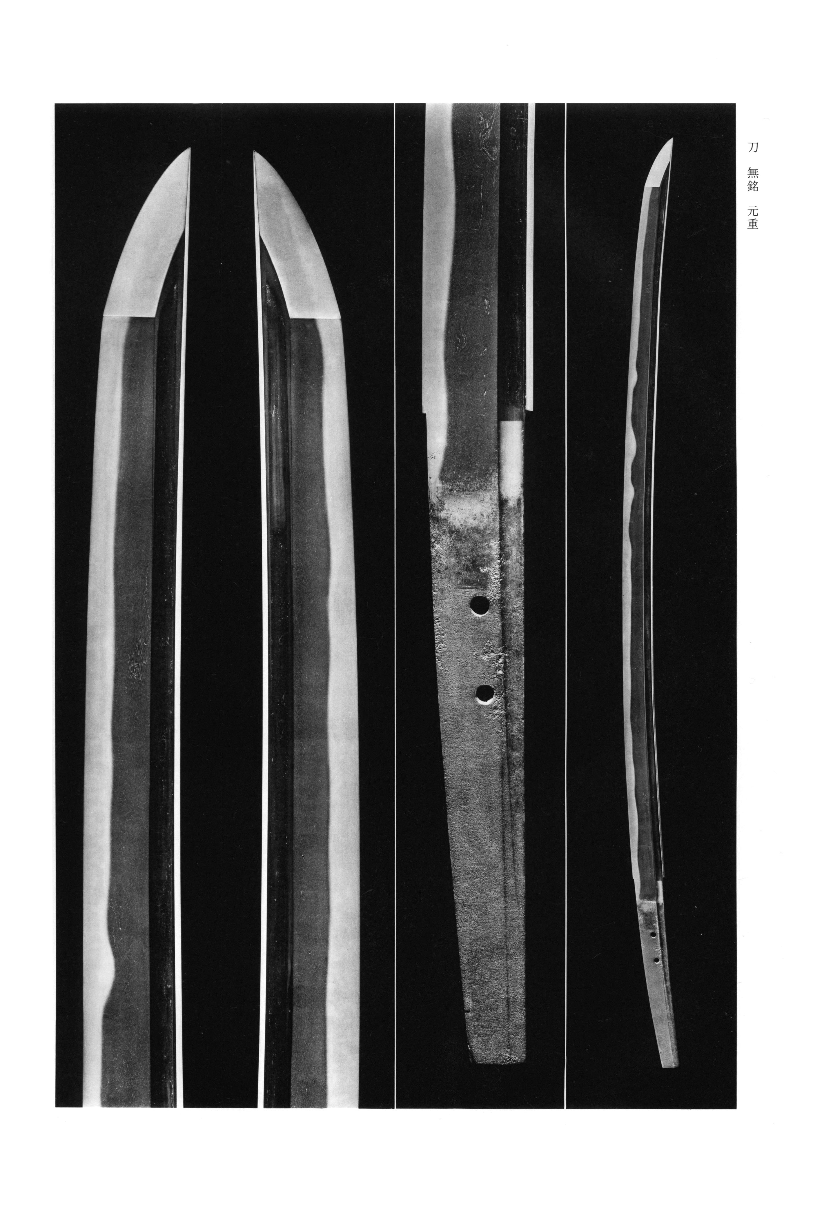 Motoshige of the group in Province represents a line of smiths distinct from Kanemitsu and Chogi. According to old tradition, Morishige was the son of Moriie, and Morishige's son was Motoshige. Dated works surviving from his hand span from the Showa era at the end of the period through Joji in the mid- period -- a productive arc of roughly forty years from about 1312 through 1368 -- and within this range there is also a theory that recognizes the existence of a first and second generation, though no established consensus has been reached as to where the boundary between them should be placed. He is counted among the makers of Soden- alongside Kanemitsu and Chogi; however, the majority of his extant works fundamentally express the tradition, and comparatively few display -style characteristics to the degree as those of his contemporaries. An exception is the transmitted in the Shimazu family (Important Cultural Property), in which the in both and is strong and and stand out, giving marked emphasis to the manner. His manner, according to old transmitted writings, is said to resemble Kagemitsu and Kanemitsu, or alternatively works of the group -- a dual affinity that constitutes one of the principal points of connoisseurial interest for this smith and his lineage.