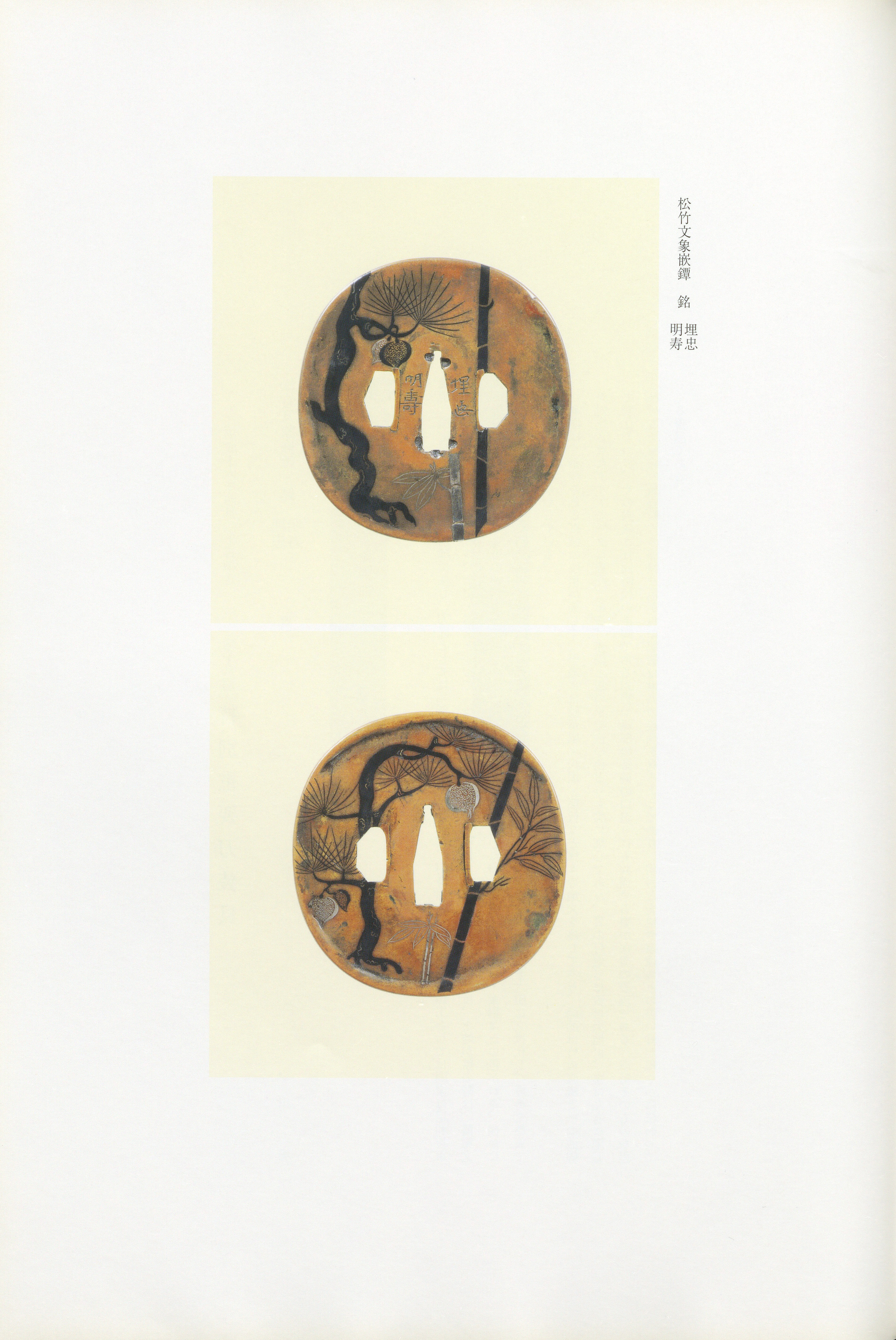 Myoju's may be broadly divided into two categories: iron works and soft-metal () works. When the ground is iron, he expresses geometric patterns — , (thunder pattern), -kaminari- (mist-and-thunder designs), and rinzu- — by means of gold , a technique originally a forte of the Shoami lineage that Myoju may initially have adopted. His iron openwork includes celebrated masterpieces such as wheel (kuruma) and double-tomoe . When brass (shinchu), , or (refined copper) serves as the ground, he develops compositions through a distinctive form of - that retains only a slight relief (), deploying colored metals — gold, silver, , , and other — in novel combinations. His chosen subjects are auspicious trees and plants — grapes, kunenbo (a citrus resembling yuzu), oak, pine and bamboo — "boldly stylized into patterns, producing an exceptionally fresh and courtly (miyabi) taste." In his iron works, the nejikaeshi-mimi (twisted turned-back rim) and gold rim inlay are techniques "at which he particularly excelled," while the iron itself is invariably "carefully selected" and displays excellent quality. In soft-metal works, ground textures including hammered (), polished (), and file-finished surfaces are deployed with meticulous care to heighten the pictorial effect.