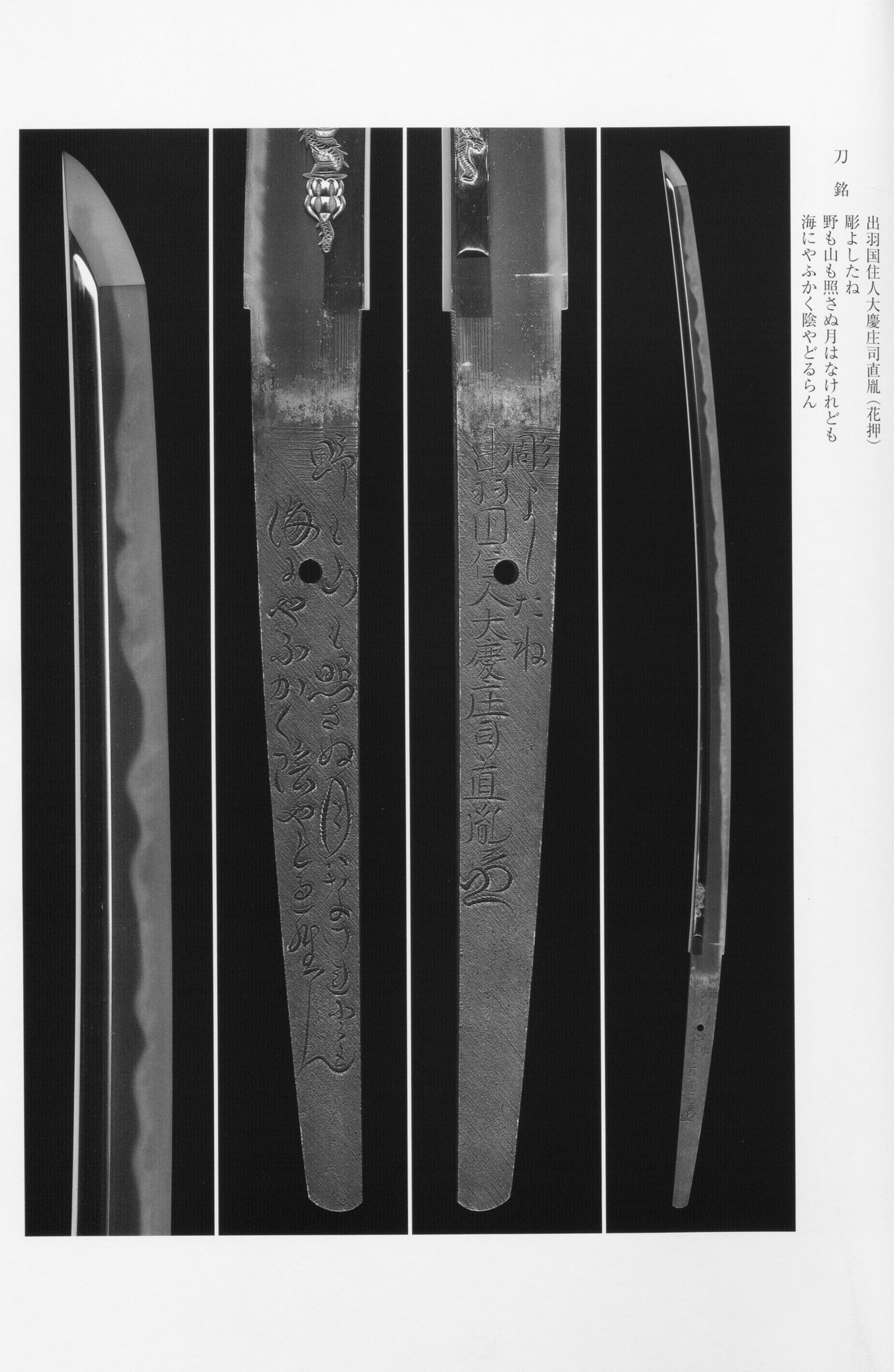 Naotane stands as the foremost practitioner of Masahide's revival philosophy and is regarded as having brought that program to its highest realization. His -style works achieve a that is bright and keen, with both and luminous and clear, and a moderately soft temper line that approaches the impression of -- a quality the consistently praise as brilliantly successful. His -style works, by contrast, display a bold and unrestrained spirit overflowing with , a martial vigor and commanding presence. The on many of his blades -- frequently executed by the carver Honjo Yoshitane, whose collaborative inscriptions are exceedingly rare -- further elevate their value. Works produced during his provincial journeys, such as the "-forged" pieces made in association with the Ota family of hereditary iron-masters, constitute important historical materials linking the smith to networks of patronage and raw-material sourcing. Among his most celebrated pieces is the known as "Tsukikage Naotane," which bears a poem chiseled on the tang and is famed as the outstanding exemplar of his -style works -- a masterpiece that encapsulates the ambition and achievement of the revival at its finest.
