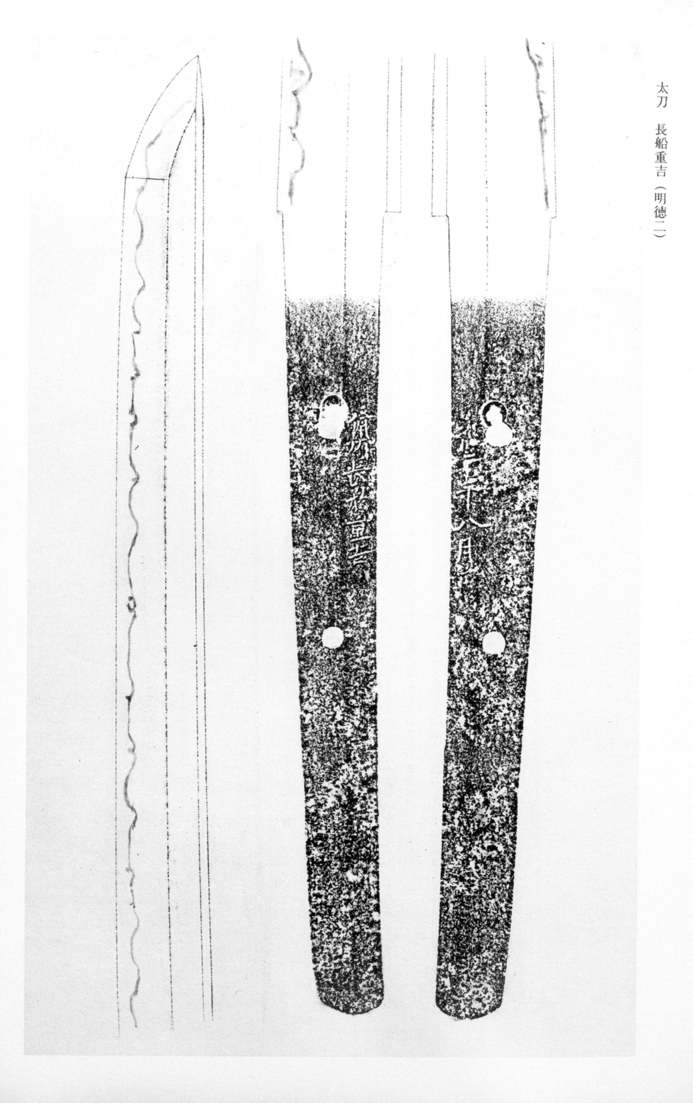 Shigeyoshi (重吉), third generation, worked in Province during the Meitoku era (1390-1394) and belongs to the group of late -period smiths commonly referred to as ("small-curvature works"). According to sword catalogs, the first generation was the son of Kagesuke and worked during the Kagen era, the second generation during Genko, and the third generation during the Joji and Meitoku periods. The smiths constitute a distinct group within that does not belong to the lineages of Kanemitsu, Chogi, Motoshige, Morikage, and the like. Besides dated examples from Meitoku, blades dated Oei 1 are also known, placing Shigeyoshi at the transitional phase from the group toward what is termed Oei-.