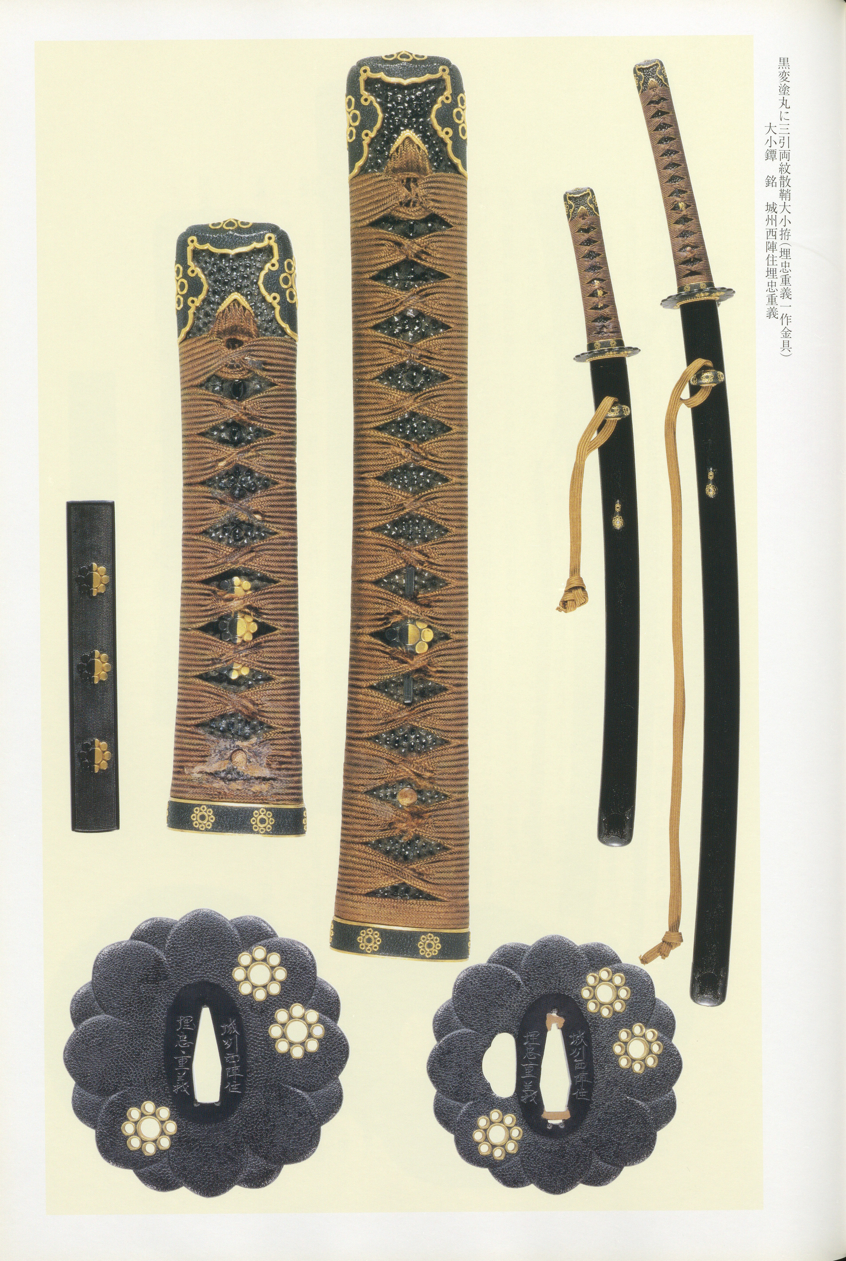Shigeyoshi commanded a formidable range of metalworking techniques. His employ grounds finished in both polished () and stone-textured () surfaces, ornamented through - (applied inlay), - (flat inlay), (undercut relief), and (gold color application). He worked fluently in multiple metals including gold, silver, , and brass, often combining them within a single composition to achieve the chuya (day-and-night) two-tone effect characteristic of his output. His complete demonstrate mastery of the full suite of fitting types, from and to , , and , unified by consistent ground treatment and decorative vocabulary.