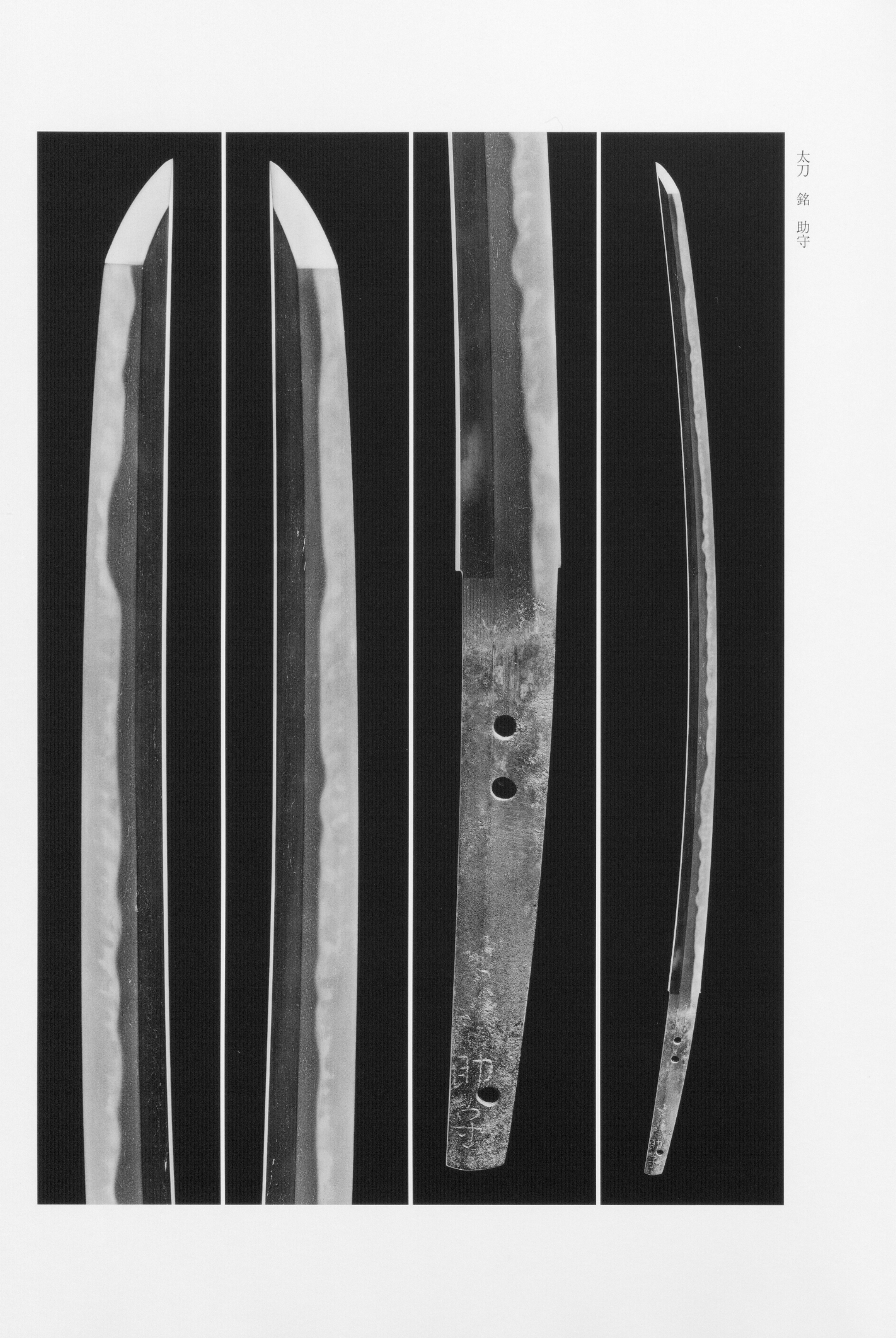 The Sukemori works are distinguished by a dense thickly covered with and fine , with standing out in the . The in these pieces is fundamentally -based with gentle undulation, mixing small and ; adheres strongly, and runs frequently. The characterizes this manner as decidedly more archaic than Fukuoka , noting that "the exhibits strong , displaying an archaic manner." In contrast, the Fukuoka Sukemori works of the mid- period present broader proportions, clearly displayed in the , and magnificent incorporating , , and angular elements in . The tempered area shows abundant activity of and , with variation in the breadth of and a brilliant, florid quality. The tends toward tightness and clarity, and and appear throughout. Signatures range from boldly cut large characters executed with thick chisel strokes to finer, more angular inscriptions, and the notes that "no other example is known of a signature style of this kind" for at least one distinctive variant.