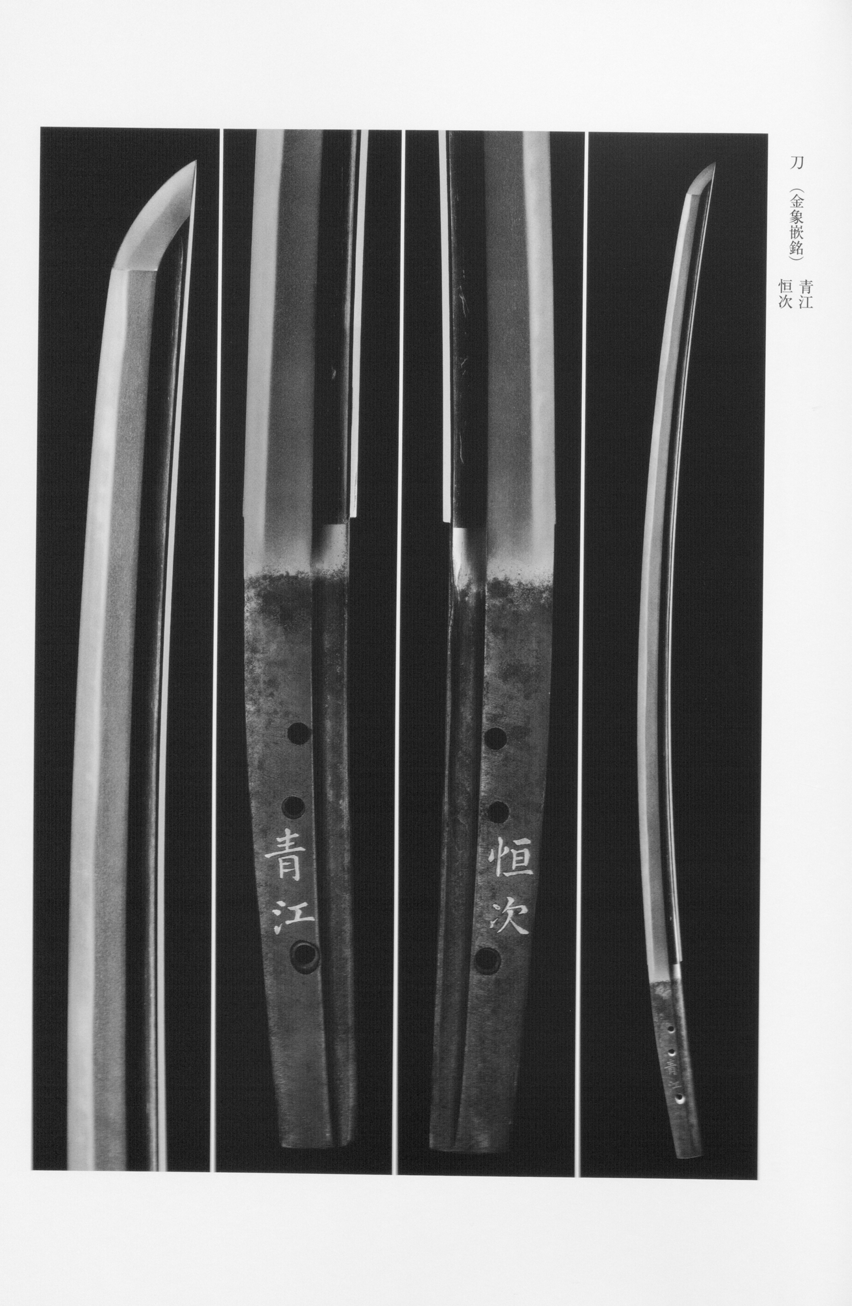 The technical character of late- Tsunetsugu work is firmly established in appraisals. The forging () shows compact mixed with , the grain standing finely to produce a — the distinctive crepe-like texture — with -like tonal areas intermixed and fine adhering closely. A hallmark of the school is the appearance of in various modes: reverse-leaning in darker bands, mottled , and the distinctive in which stands near the edge while appears toward the . The is fundamentally , into which , , and reverse-slanting elements are mixed; — the so-called — enter plentifully alongside and . The tends toward , a tightened quality, yet remains bright and clear, with predominating and adhering.