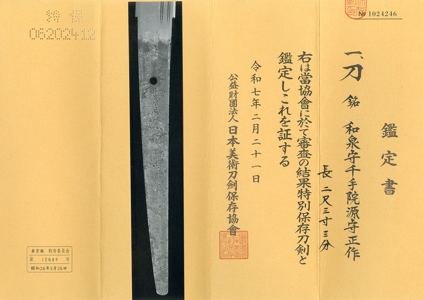Katana:Amata Akitsugu Saku Kore (Living National Treasure) A fortunate day in January, 1977 Made on request by Mr. Takeshi Muraki (NBTHK Tokubetsu Hozon Token)