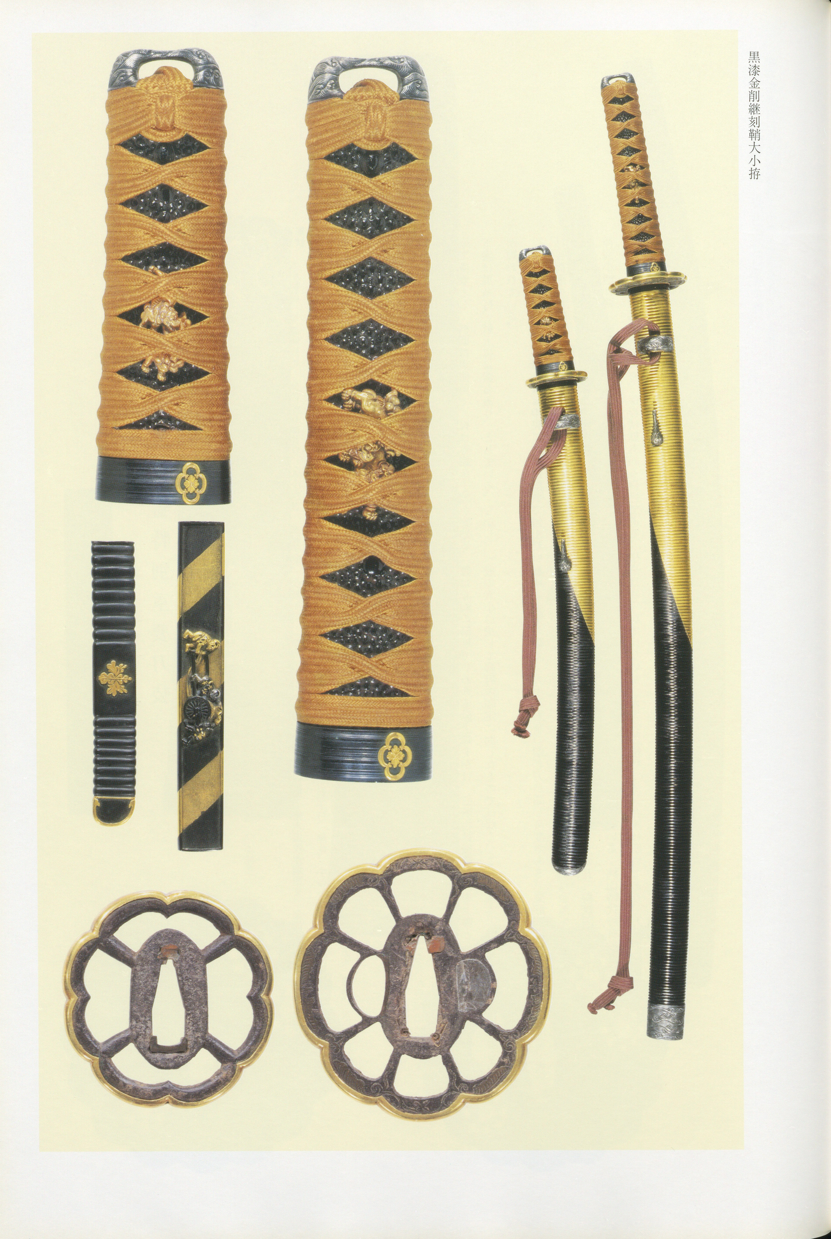 The collective style of the Goto house — also known as iebori, or "house carving" — is defined above all by the mastery of grounds bearing gold ornamental motifs () executed in with . This combination of jet-black plate, minutely punched texture, and luminous gold high-relief decoration constitutes the school's signature visual language. Reverse plates are characteristically finished with gold lining ('), and are frequently rendered in solid gold () with sculptural carving (yobori). The repertoire of forms centers on the — the matched set of , , and — as well as unified suites of fittings (soroi ) for formal and mountings, in which every component from to is executed in with family crests scattered in gold. Subject matter draws heavily on auspicious and literary themes — lions, kirin, chickens, cranes and pines, dragons amid waves, the Four Sleepers — rendered with what the consistently describes as "ample volume in the modeling" and chisel work that is "vigorous" yet possessed of "a calm, elevated dignity."