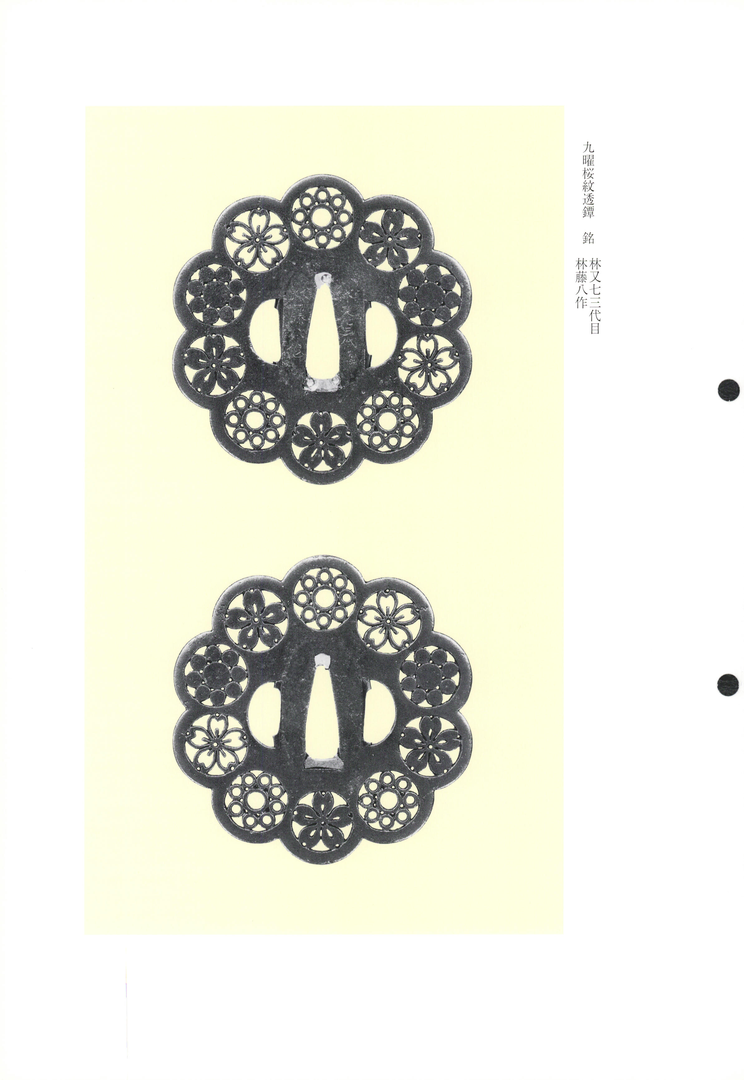 The hallmark of Hayashi workmanship resides in the exceptional quality of the forged iron plate, repeatedly described in the records as possessing a dense, lustrous character likened to the dark tone of yōkan (sweet bean jelly). This singular iron—often displaying the purplish patina (shisaku) characteristic of —is worked with a viscous, clinging texture that could only be achieved through meticulous forging. The (hammer-textured ground) is handled with subtle modulation, imparting a softened feeling to carved surfaces and openwork edges. Design motifs draw upon classical themes imbued with scholarly resonance: bamboo rendered with springy resilience, as if stirred by a pure breeze; pine branches expressing spacious elegance; cranes and cherry blossoms arranged in compositions of refined simplicity. Openwork techniques include both bold (ground openwork) executed with decisive chisel thrusts, and more delicate kage- (shadow openwork) that leaves subtle relief. Decoration is restrained yet effective: gold inlay in the horikomi- (carved-in inlay) manner, often featuring the maker's favored "withered tree" (kareki) motif or twisted-rope (nawa-me) patterns rendered as perfectly round beads. The integration of design, carving, and inlay achieves a coherent whole in which each element supports the others without ostentation.