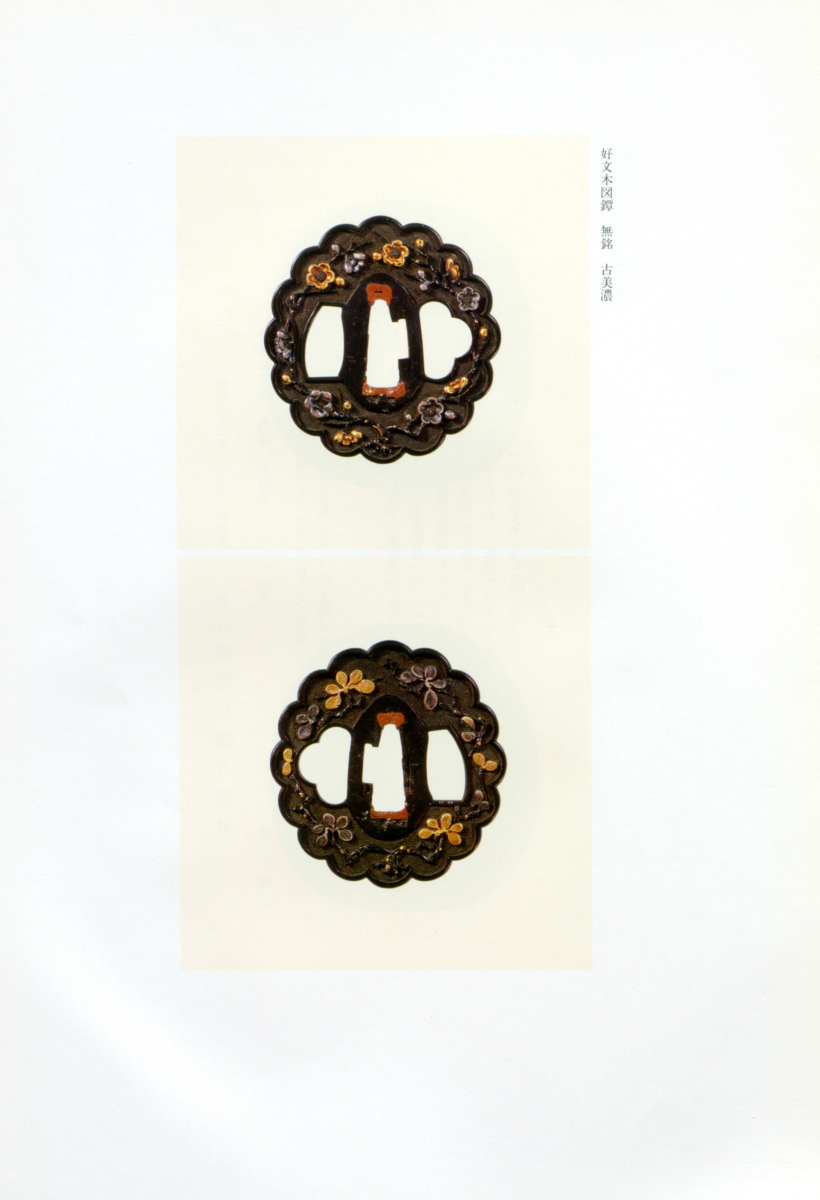 The defining characteristic of work lies in its powerfully sculptural carving method, often described as "'s deep carving" ( no fukabori). On , , and , crests and motifs are executed with sharply rising chisel edges and pronounced three-dimensional relief achieved through and techniques. In , thin metal plates are worked with dramatic alternations of height and depth, frequently incorporating extensive openwork piercings () that heighten the sense of movement and sculptural presence. Materials typically include and with grounds, embellished with refined gold and silver applied either through (smooth, untextured reserves) or delicate inlay (). Thematically, artisans favored autumn grasses—chrysanthemums, bush clover, patrinia—rendered with rich poetic sentiment, as well as grapevines (symbolizing the martial way through wordplay on budō), seaweed and shells (mogai-zu), pine trees, peonies with lions, and dragons. The so-called " dragon" (-ryū) represents a particularly distinctive motif, characterized by a tightly drawn body with numerous piercings and the dragon grasping the sacred jewel from the side, in marked contrast to Gotō dragons.