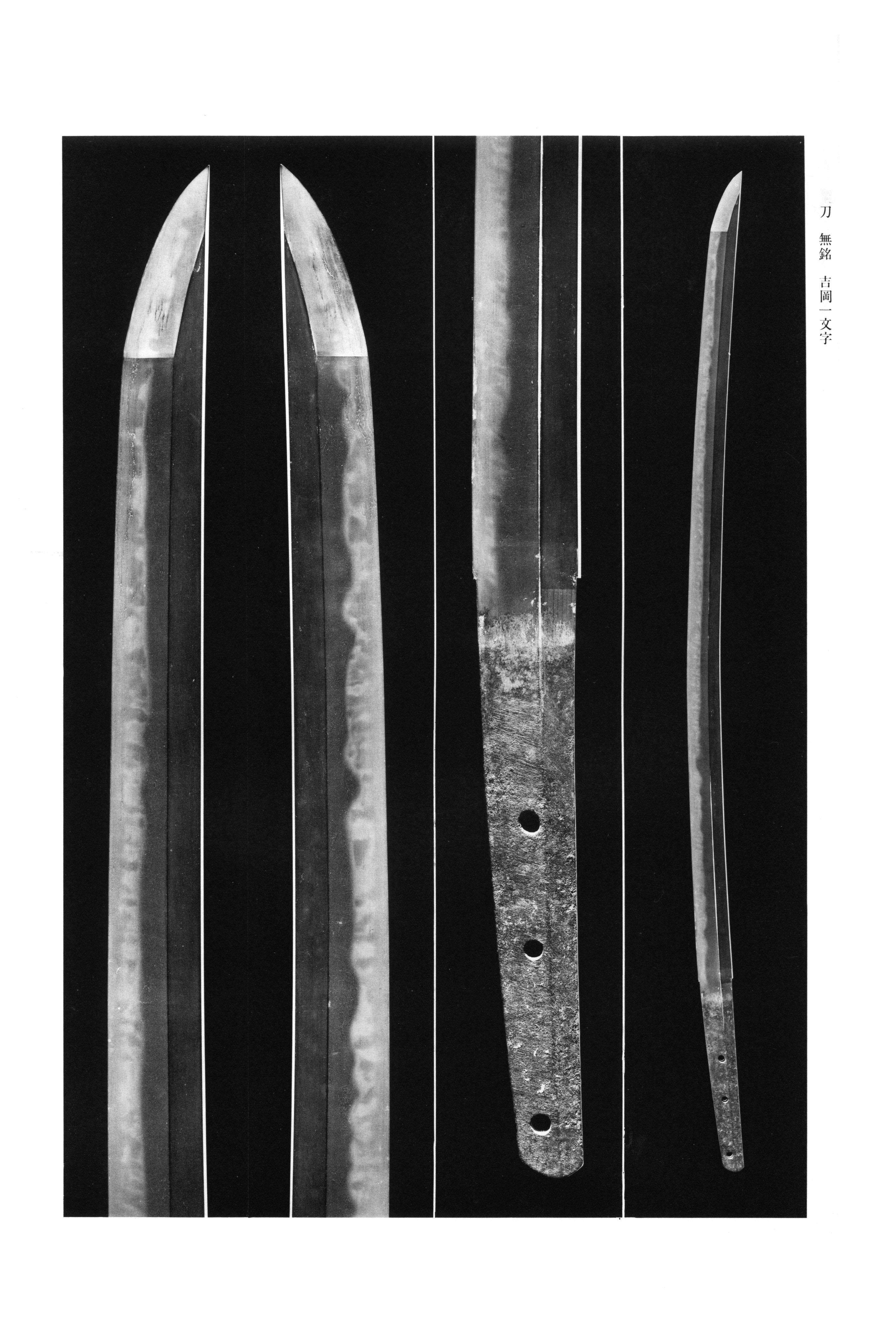 In terms of forging and tempering, Yoshioka work displays a markedly different character from the exuberant productions of Fukuoka . Whereas the earlier Fukuoka masters are celebrated for large-patterned, flamboyant , Yoshioka smiths generally favored a more restrained aesthetic. The is typically forged as dense or , occasionally incorporating or flowing grain (); very fine adheres thickly throughout, and the ground steel exhibits a bright, clear quality. A particularly diagnostic feature is the conspicuous presence of —shadowy temper reflections that rise vividly from the area and extend toward the and cutting edge. In the , forms the foundational pattern, yet it is frequently mixed with and pointed elements (), creating an overall smaller-scaled and denser composition. The temper line is characteristically -dominant with fine , and internal activities such as , , and appear throughout. A tendency toward reverse-slanting elements () and subdued passages () within the serves as a further point of connoisseurship. The generally enters in small , turning back in , with occasional pointed tendencies or vigorous forming flame-like effects at the tip. In form, Yoshioka blades preserve dignified with high and when , though many examples have been greatly shortened; even shortened works often retain a pronounced taper from base to tip and proportions.