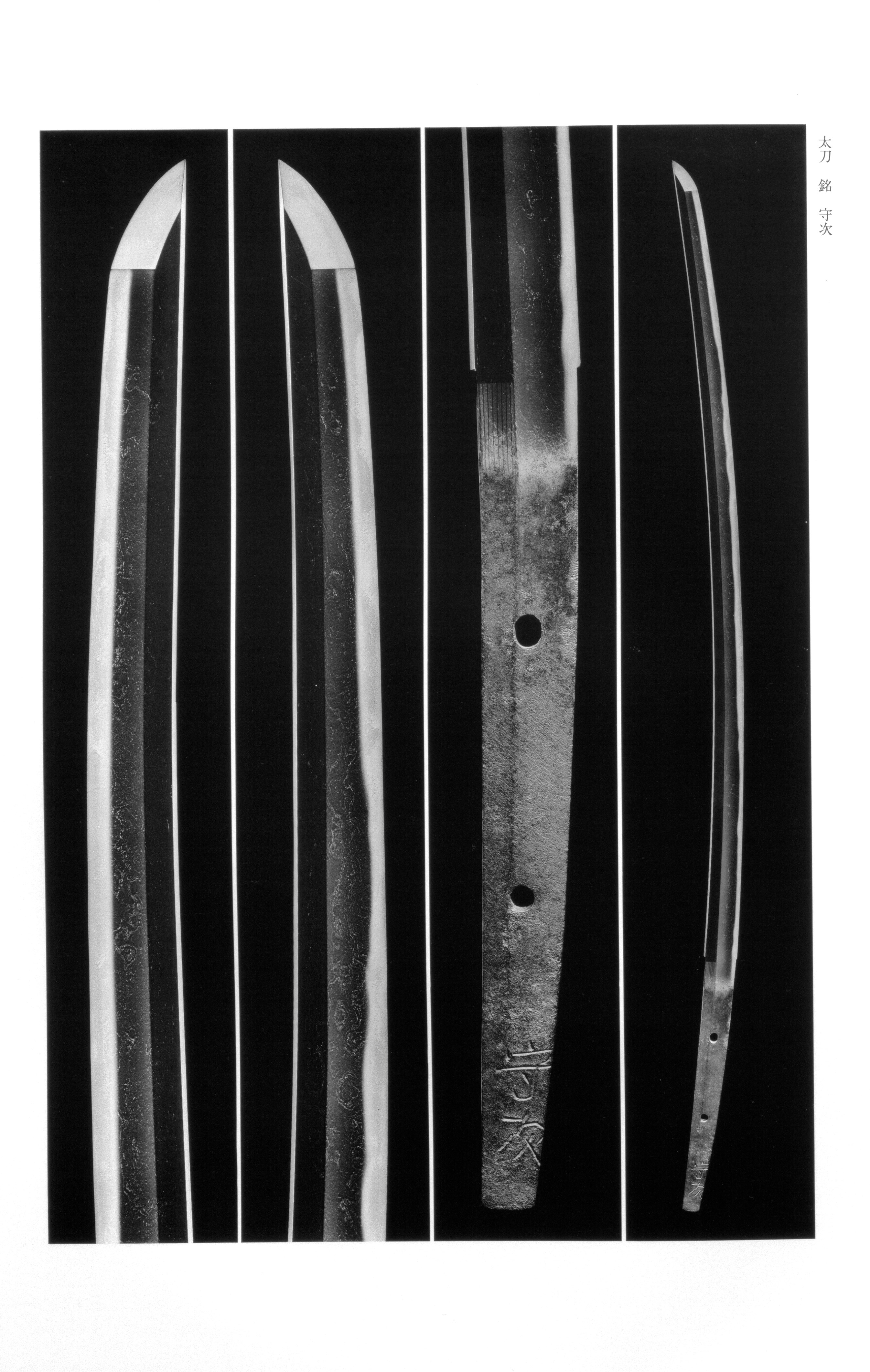 The name Moritsugu encompasses several distinct lineages of swordsmiths active across different provinces and eras. The most venerable is the line: Moritsugu is traditionally regarded as the son of Yasutsugu (also called Anji), who is held to be the founder of the school. From the period onward, the name was inherited through successive generations down into the period. Among extant signed works appraised as , the distinguishes two principal types of : a semi-cursive (gyosho) style with vigorous chisel strokes incorporating - (reverse chisel work), and an expansive, freely flowing cursive (sosho) style — the former appearing to date slightly earlier. A separate Moritsugu, though not prefixing his name with the character "," is placed within the Ukan school of Province on the basis of both his style and signature manner, with extant signed works exceedingly rare. In the era, a further Moritsugu emerged as a leading figure of the Fukuoka Ishido school in Province. After the death of his father Rihei, he studied under his cousin Koretsugu and, according to tradition, succeeded to the headship of the main family line when Koretsugu's heir Toshitsugu predeceased his father. He died in Genroku 14 (1701) at the age of sixty-nine.