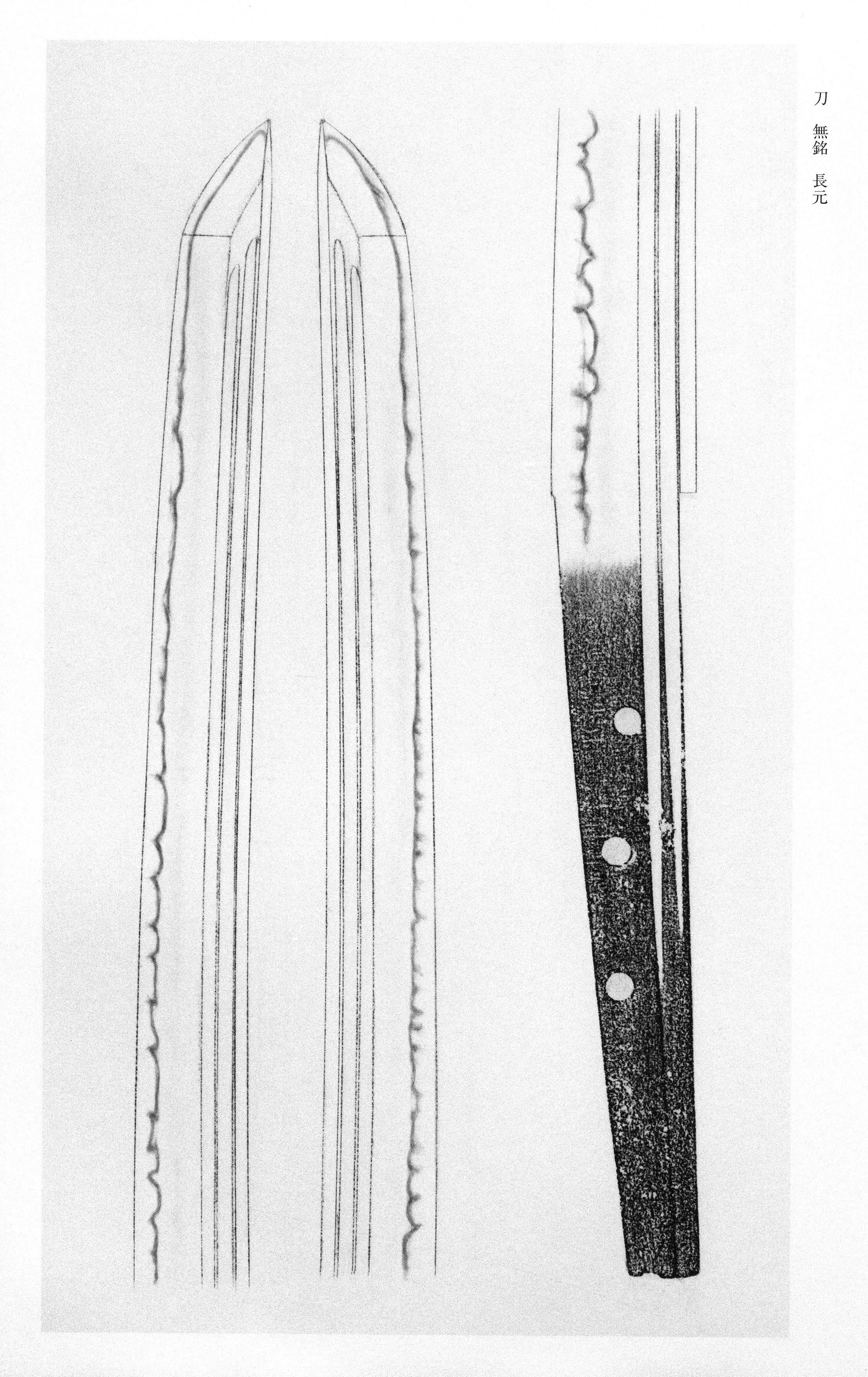 Nagamoto's style is characterized by slender and gentle with pronounced and , often terminating in . His presents tightly forged , sometimes mixed with , bearing fine and abundant , with standing out prominently. His typically centers on mixed with and pointed elements, approaching Nagamitsu's calm manner; alternatively, he produces a quiet into which - are interspersed. The tends toward — a characteristic tightness — and the frequently becomes shallowly , turning back in to form the pattern known as the sansaku-. In works of broader temper, deep with well-adhering is accompanied by and , yielding a vivid .