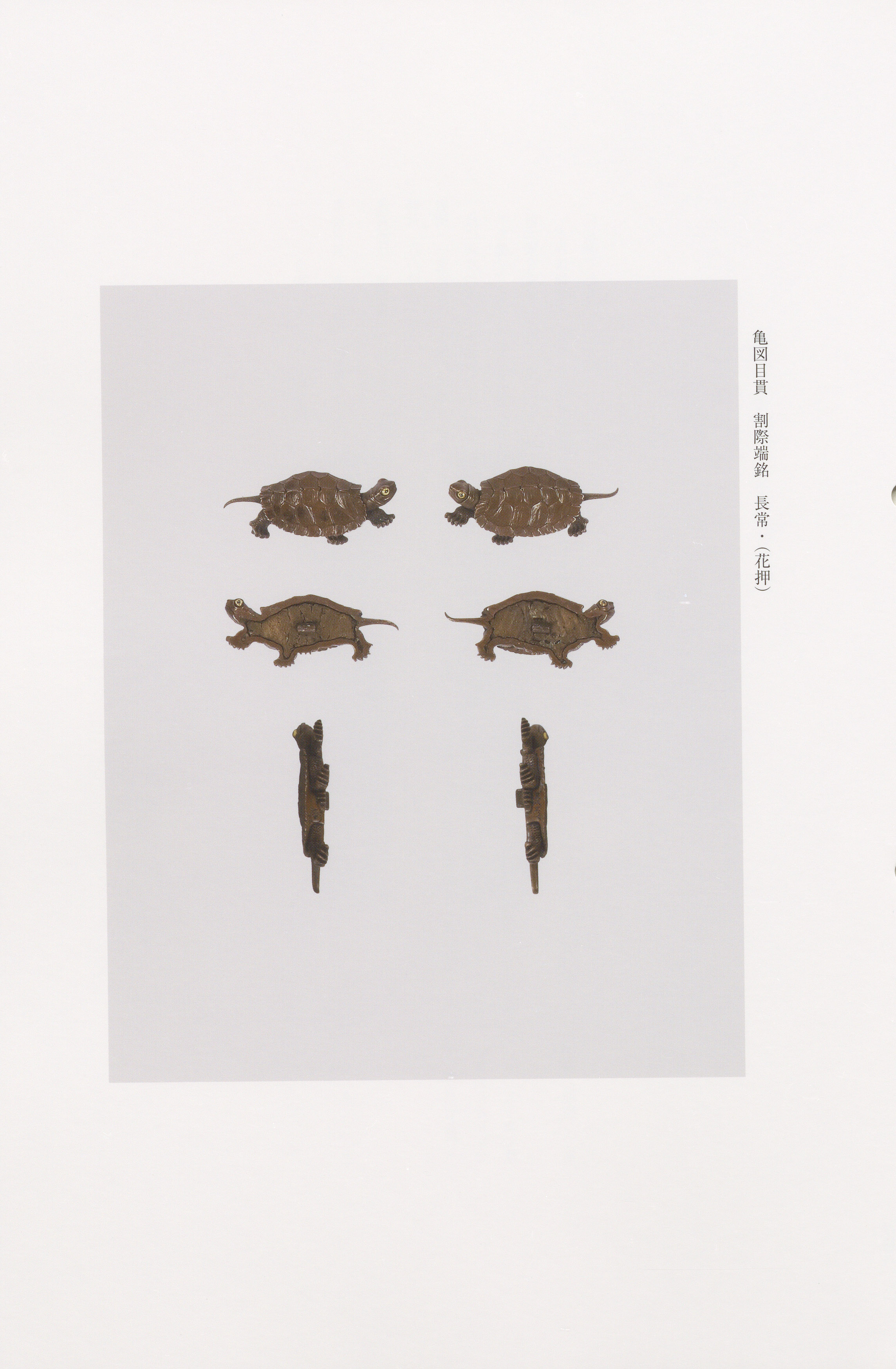 Although Nagatsune was highly skilled at Goto-style (high-relief carving), it was through - (flat inlay) combined with (single-chisel engraving) that he achieved his distinctive manner and lasting fame. On polished or grounds, he deployed modulated chisel strokes of varying depth and intensity, from forceful outlines to the finest facial details and textile patterns, producing compositions described by the as possessing "outstanding pictorial power" developed through his study of Maruyama-school painting. His is characterized by "modulated strengths and rhythmic inflections" and "supple chisel-work," while his inlay marshals gold, silver, , , and with what the examiners term "precise, well-judged" placement. In sculptural works such as , he drove the chisel along every surface to achieve fully three-dimensional expression -- rendering subjects "as if alive" with "animated movement." His favored subjects ranged widely from nature studies (turtles, toads, snails, chickens, monkeys) to Chinese literary figures (Guan Yu, Huang Shigong and Zhang Liang, Ma Shi-huang) and genre scenes (cormorant fishermen, Bon festival dancers, agricultural labourers at rest). A hallmark of his compositional intelligence was the extension of designs onto the reverse plate, prompting the viewer to "imagine and anticipate the scene continuing" -- a device the has repeatedly singled out as "truly superb." He also innovated freely within the format, sometimes varying the ground metal between and in chuya- ("day-and-night") pairings, or between solid gold and to differentiate the paired pieces.