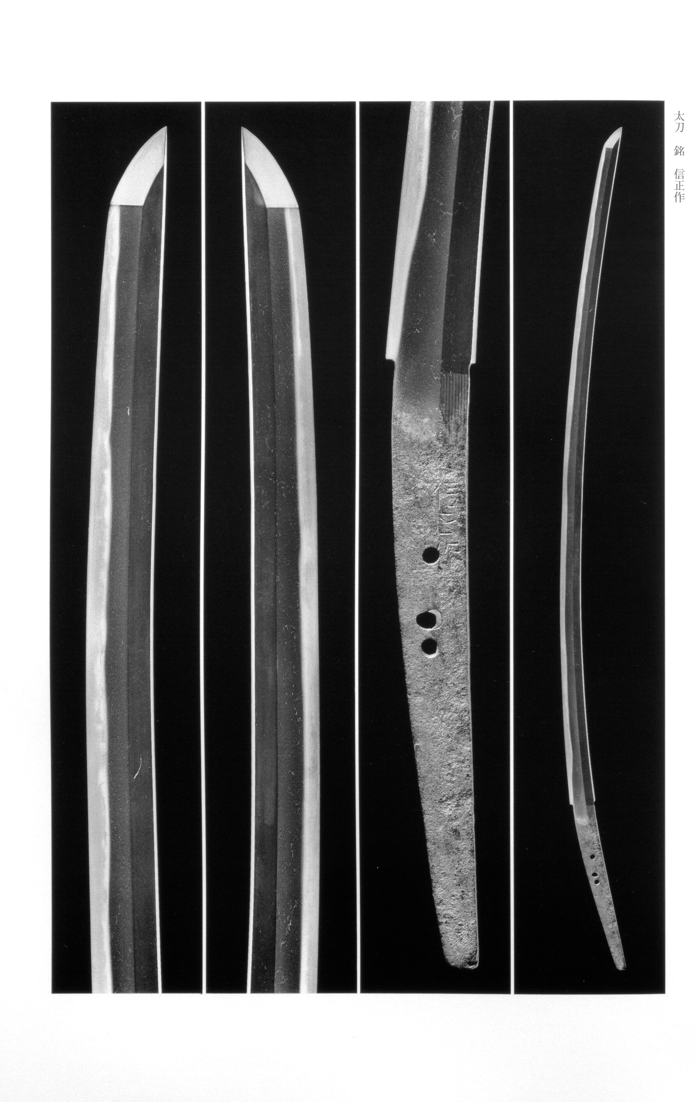 Nobumasa's characteristically display high with pronounced and terminate in , producing a graceful and dignified possessing a high classical tone. The is worked in mixed with , with fine adhering and present; stands out prominently in the . The is typically -based with mixed and , executed in with and entering and fine running through the temper. The enters straight, turning back in , sometimes showing at the tip. Where appear, a is carved at the base of the .