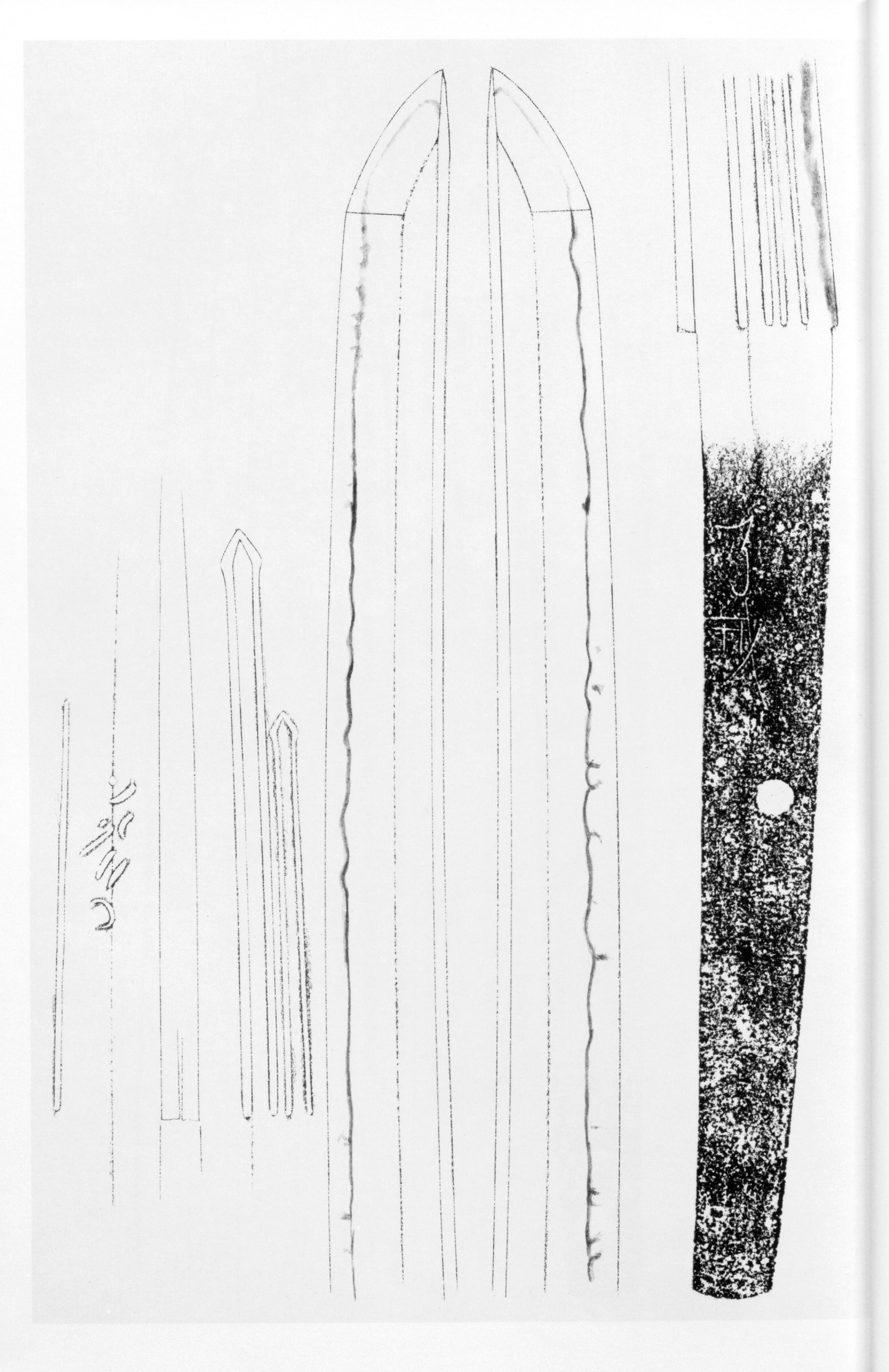 Ryokai's workmanship shares a clear line of continuity with that of Kunitoshi, yet it possesses distinguishing traits the identifies as key points of appreciation. The forging shows a -- a tendency toward straight grain -- in which a whitish cast stands out conspicuously. The temper is a rather quiet, restrained whose is tight, with adhering, and which further displays a tendency toward , a moist, soft quality that produces a particularly distinctive character. In some works is mixed into the , with fine entering continuously; in others, and impart a Yamato-like feeling. The tends to be slightly higher than in other works. Among his , which are relatively numerous, some employ construction -- a feature shared with Kunitsugi and considered one of the distinctive characteristics of the school.