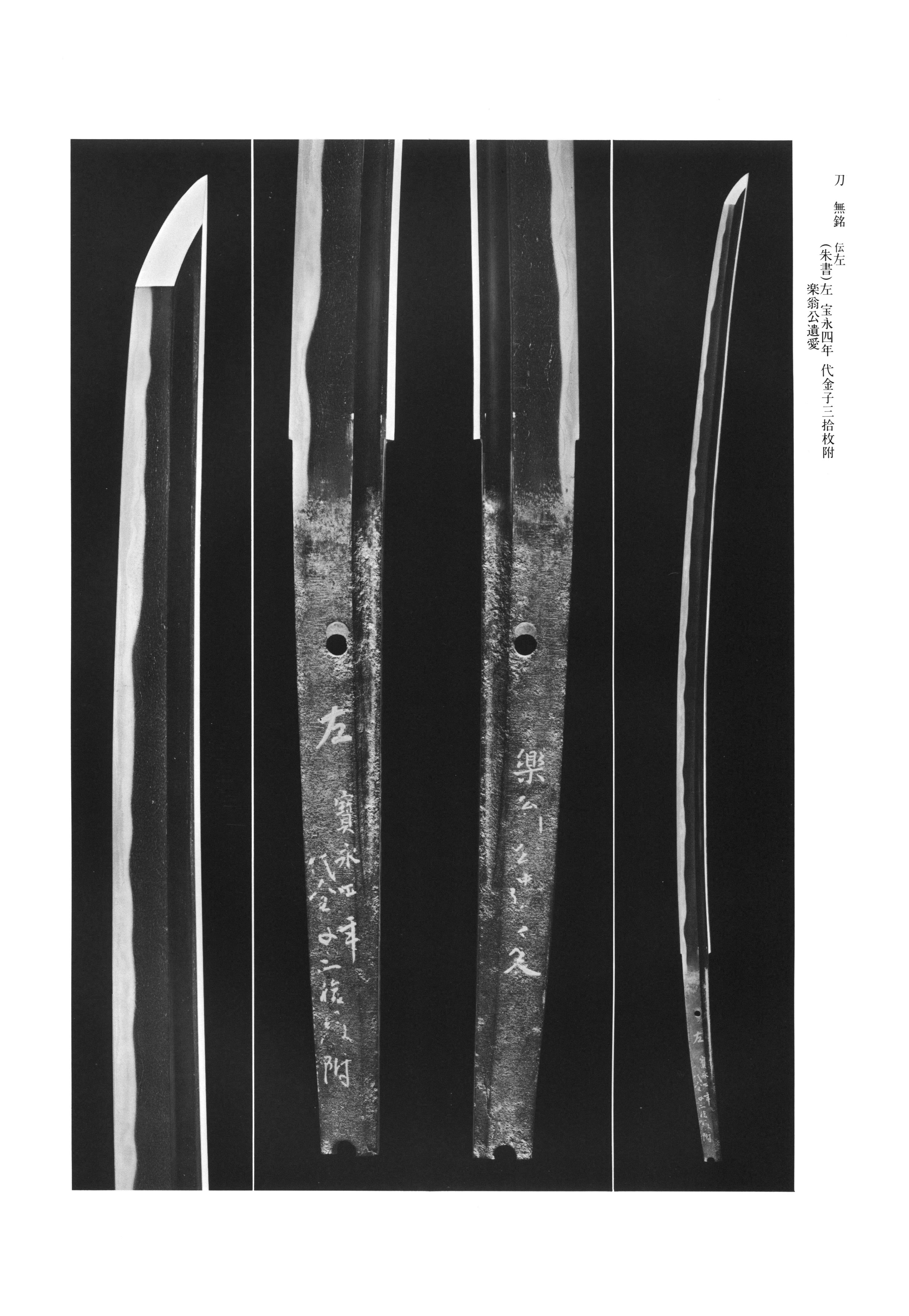 (左文字), commonly known as O- or ("Great "), was a swordsmith of Province active in the early period. He is traditionally transmitted as the grandson of Sairen and the son of Jitsua, and the character "" (左) in his signature is understood as an abbreviation of "Saemon Saburo." Since the period, sword treatises have recorded him among the outstanding disciples of Masamune of , and though the validity of this remains open to further examination, - influence is unmistakably present in his work. broke decisively from the older, classical manner of Kyushu workmanship -- a style in which both and tended to be subdued and rustic, with tempering built principally around -- and established a refined, sophisticated idiom not previously seen among Kyushu-made blades. From his lineage emerged many highly skilled disciples -- Yasuyoshi, Yukihiro, Yoshisada, Kunihiro, Hiroyasu, Hiroyuki, Sadayoshi, and others -- each inheriting aspects of the master's manner and flourishing greatly during the period.