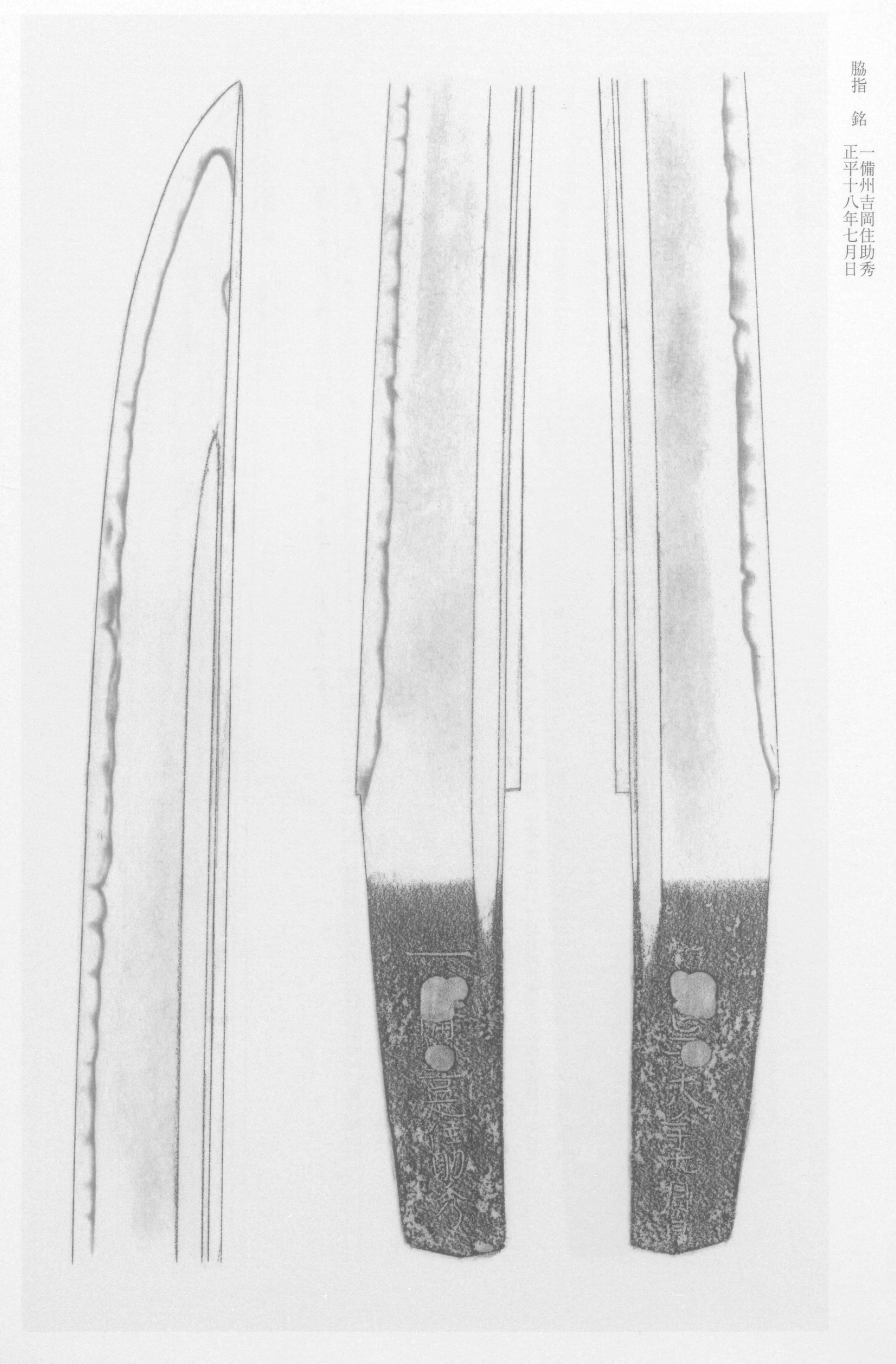 The Fukuoka works attributed to Sukehide exhibit mixed with , forged densely, with fine adhering in a thick layer and fine entering well. The stands out clearly, and or vivid appears distinctly in the . On certain the tempering takes the form of a quiet mixed with shallow and , producing a tight and bright — a serene temper that creates a striking contrast between and . Other works display a mixed with and , rendered in a manner that clearly expresses the style of the Fukuoka school at its peak. The Yoshioka works, by contrast, tend toward a somewhat smaller-scale workmanship in which stand out within the , accompanied by fine and , with appearing in varied forms.