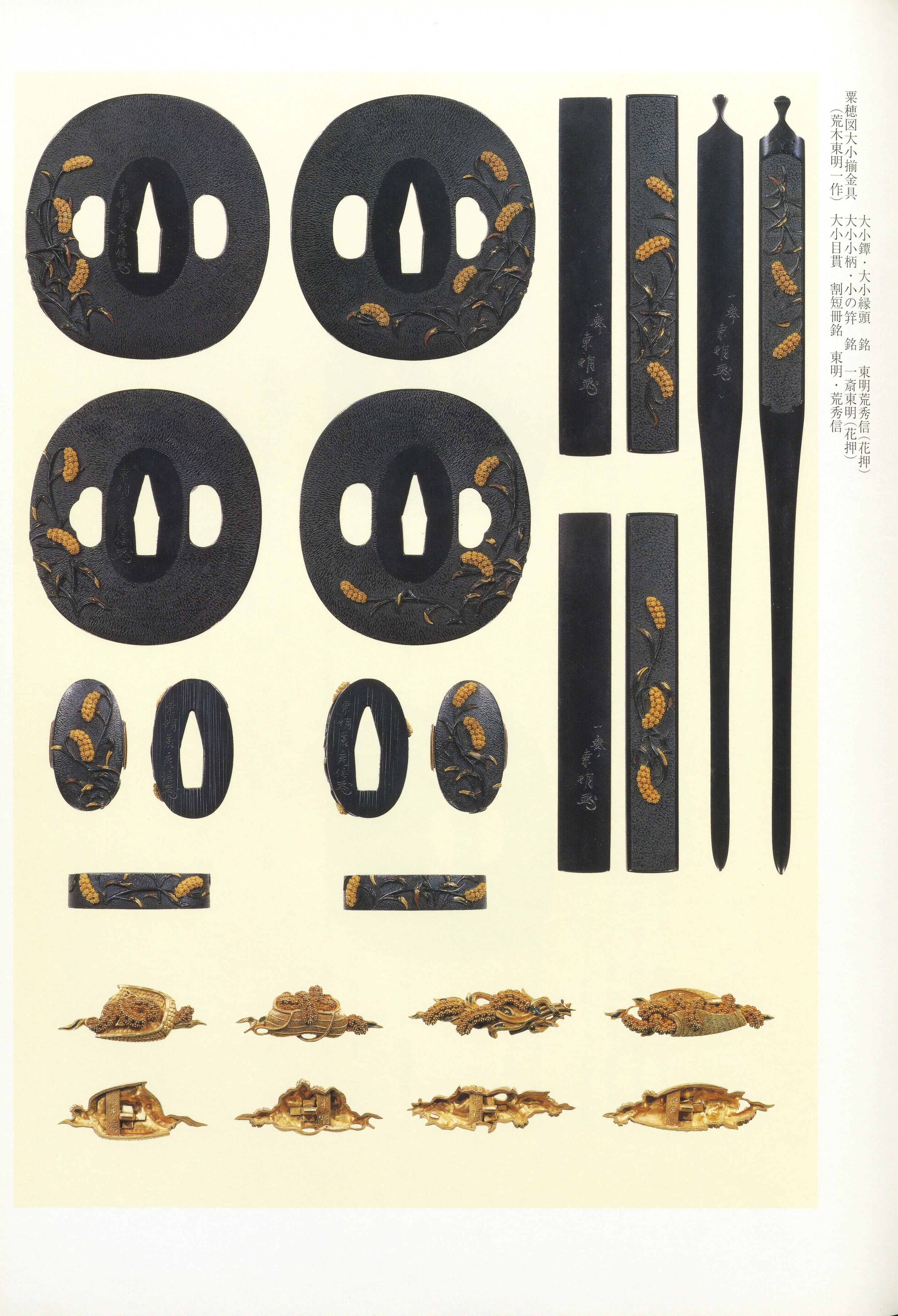 Across his designated works, the consistently praises Tomei's millet-ear carvings as occupying a distinctive world of expression that admits no rival. The phrase "the arena in which Tomei excelled above others" recurs as a hallmark evaluation, underscoring that this sculptural artistry was uniquely his domain, far beyond the reach of other artists. Even works departing from the millet subject -- such as his depictions of Mt. with the Longevity Star Deity, or the Two Deities Daikoku and Bishamonten -- are recognized for exceptionally precise carving and high technical ability applied to a dense, lustrous . His compositions balance splendor and restraint in just measure, and his complete mounting suites are praised for achieving a refined elegance of unmistakably Kyoto-style character. The describes the overall tone of his representative works as elevated and dignified, with a lyrical feeling that fully merits the appellation "Tomei of the millet ears." His position within the late Goto tradition is that of a master who, while grounded in the hereditary methods of the Ichijo school, brought to them a pictorial sensibility and sculptural vitality that defined the highest achievement of Bakumatsu-era kinko in Kyoto.