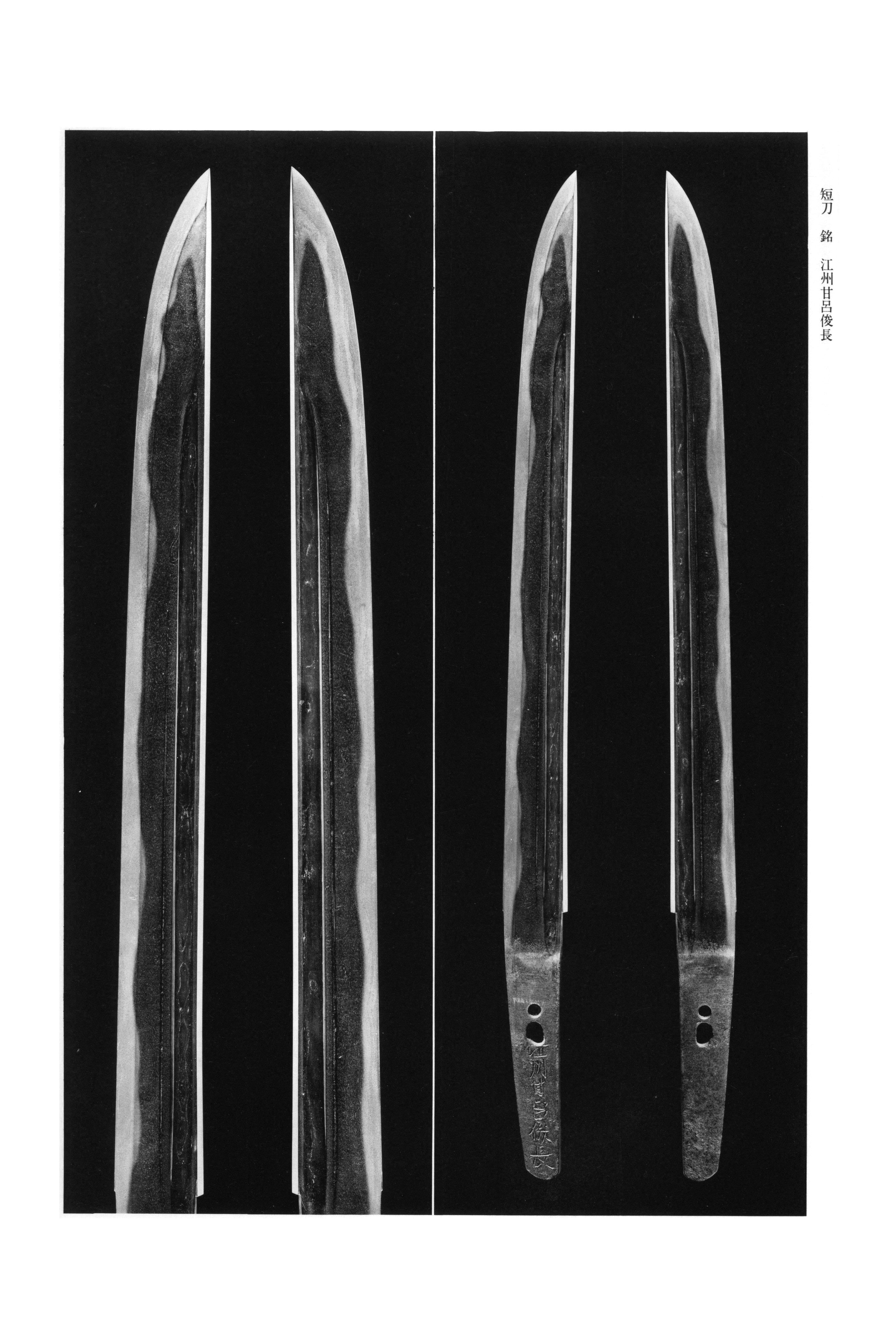 Kanro Toshinaga (also recorded as Amaro Toshinaga; 甘露俊長) was born in Takagi in Goshu (Omi Province) and is traditionally transmitted as a disciple of Takagi Sadamune. The , however, has consistently observed that "judging from extant signed works -- and -- it is difficult to acknowledge this relationship," concluding instead that Toshinaga was a swordsmith of the general period, active from the close of the period through the period and thus nearly contemporaneous with Sadamune rather than subordinate to him. Extant signed works are described as "exceedingly rare," yet examples survive in both and forms, providing the documentary basis for attributing a broader body of unsigned blades to his hand.