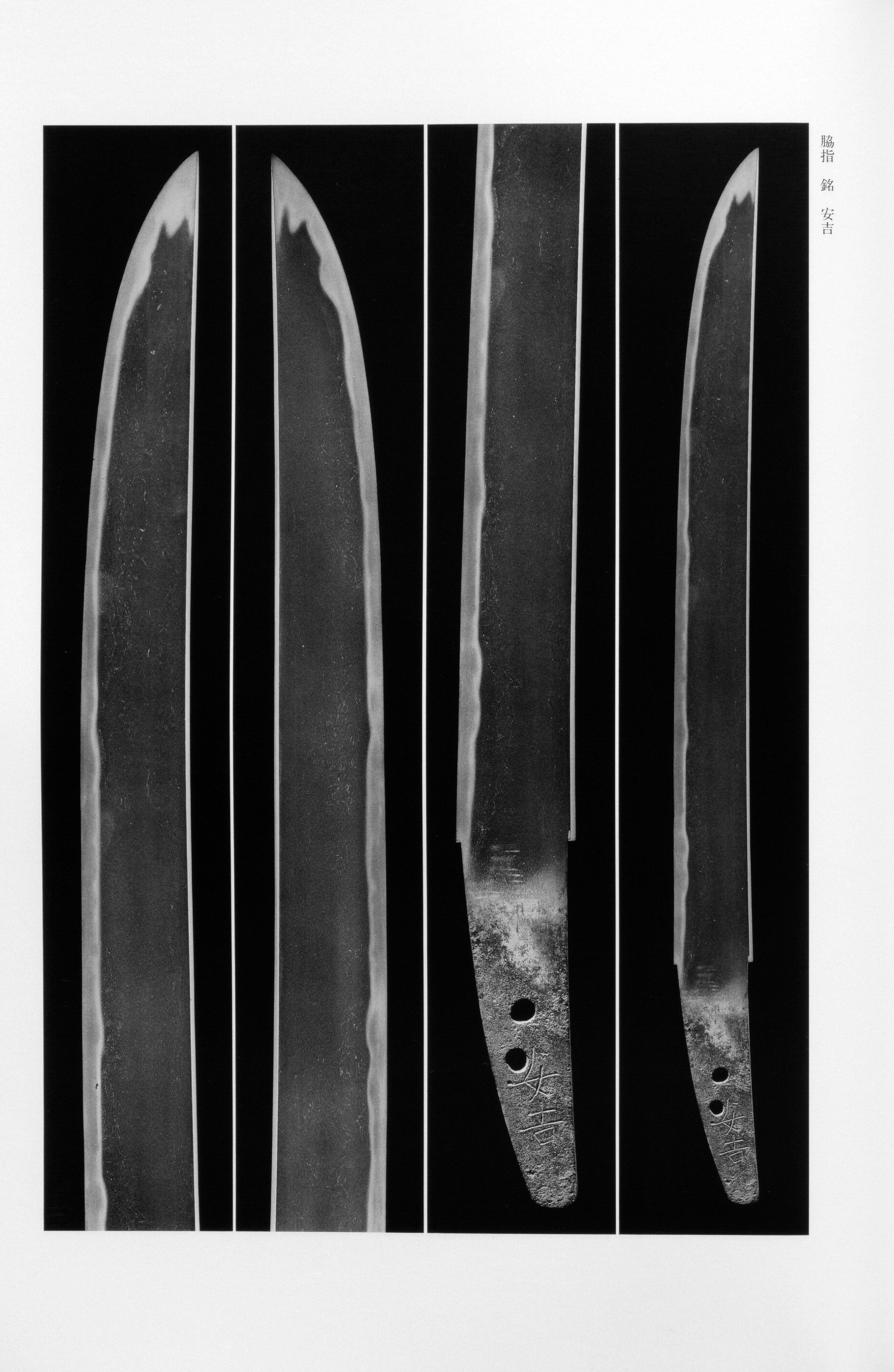 Yasuyoshi's forging typically shows mixed with and , with the grain standing out (); thick adheres, enter well, and a straight or whitish — often described as — is a recurring feature. The , while clear, is characteristically "not as clear as 's." His is mixed with , , and , rendered in a -dominant manner with and accompanied by fine and . The repeatedly identifies his defining trait as a temperament "in which elements are intermingled" within the broader group — to the extent that "at a glance the style can be mistaken for works such as those of Kanemitsu." The is among his most distinctive features: rising in , inclining toward the edge, becoming pointed with , and turning back long — a "forceful impression" that the considers a hallmark of the lineage. On certain works, a deep, softly inflected carrying a pronounced -ai ("salt-like" texture) draws particular attention, producing rich variation together with the abundant internal activity of the tempered edge.